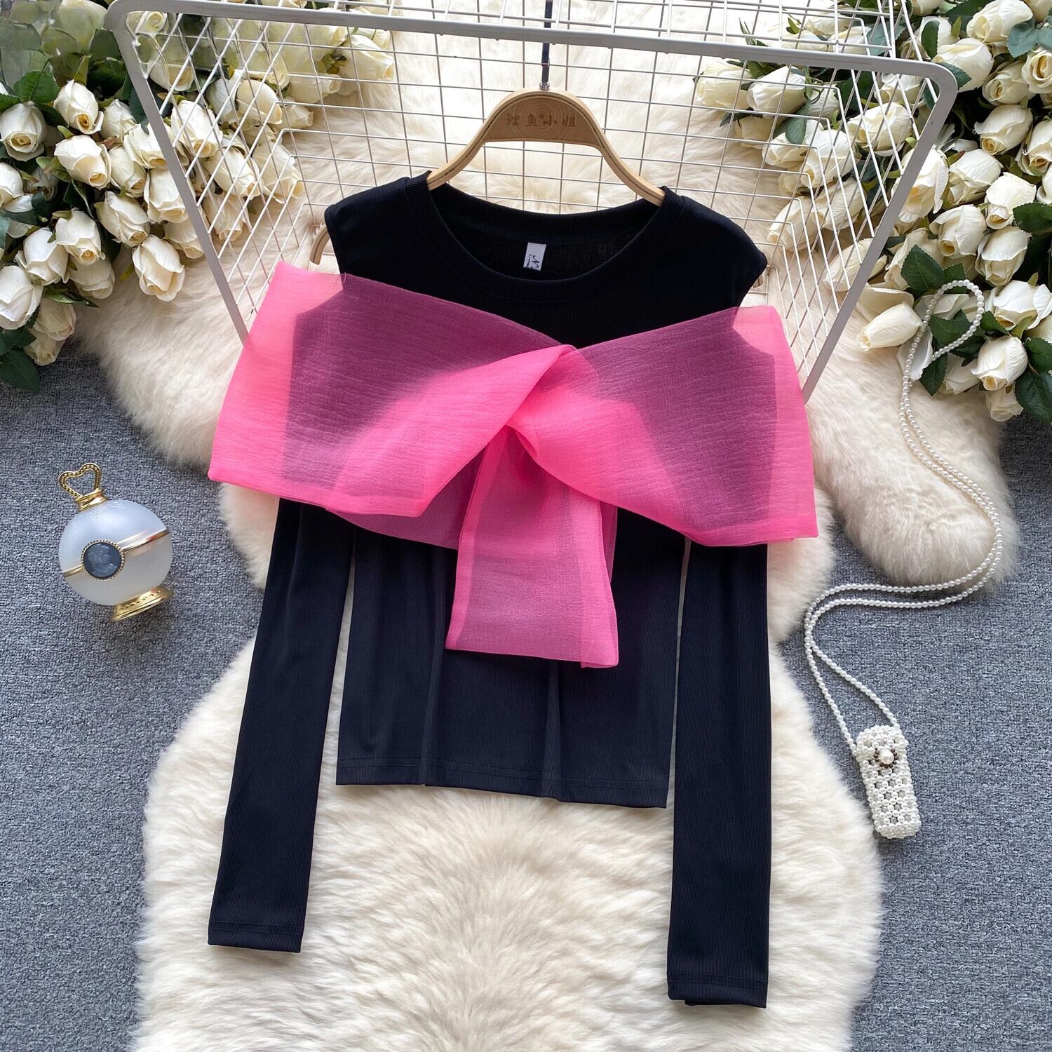 Nomikuma メッシュちょう結びパッチワークヒットカラーグラフィック Tシャツ秋長袖スパイシーガール Y2k シャツトップス ロング リボン オータム 秋物
