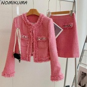 Nomikuma 秋冬 2 枚セット長袖 O ネックショートカーディガンコート + ウエスト A ラインミニスカート ロング オータム 秋物 ウィンター 冬物 Oネック Aライン