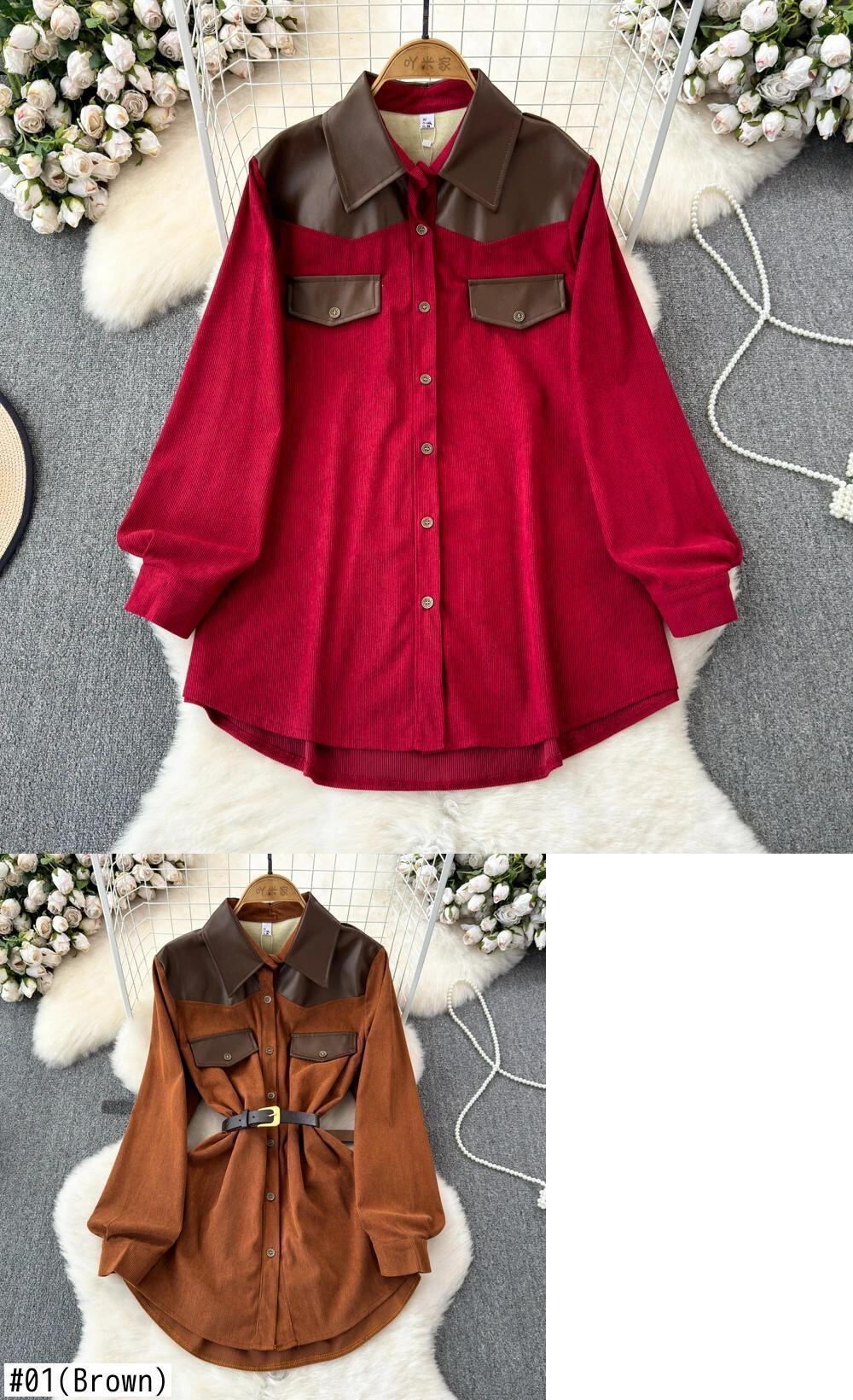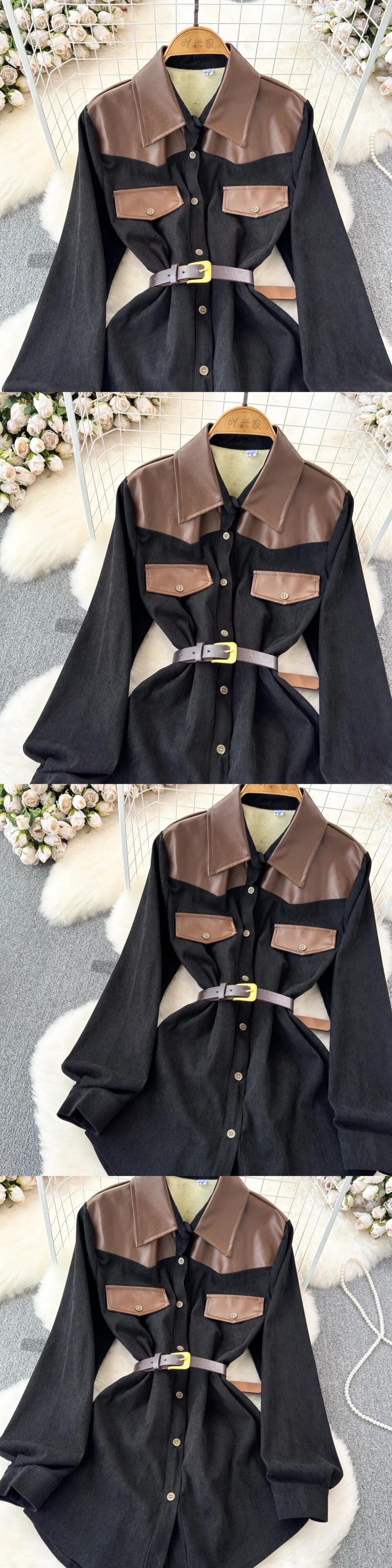 Nomikuma 春レトロ PU パッチワーク パフスリーブ シャツ ターンダウン カラー ベルト スリム ウエスト ミディアム ロング ブラウス スプリング 春物 ハーネス