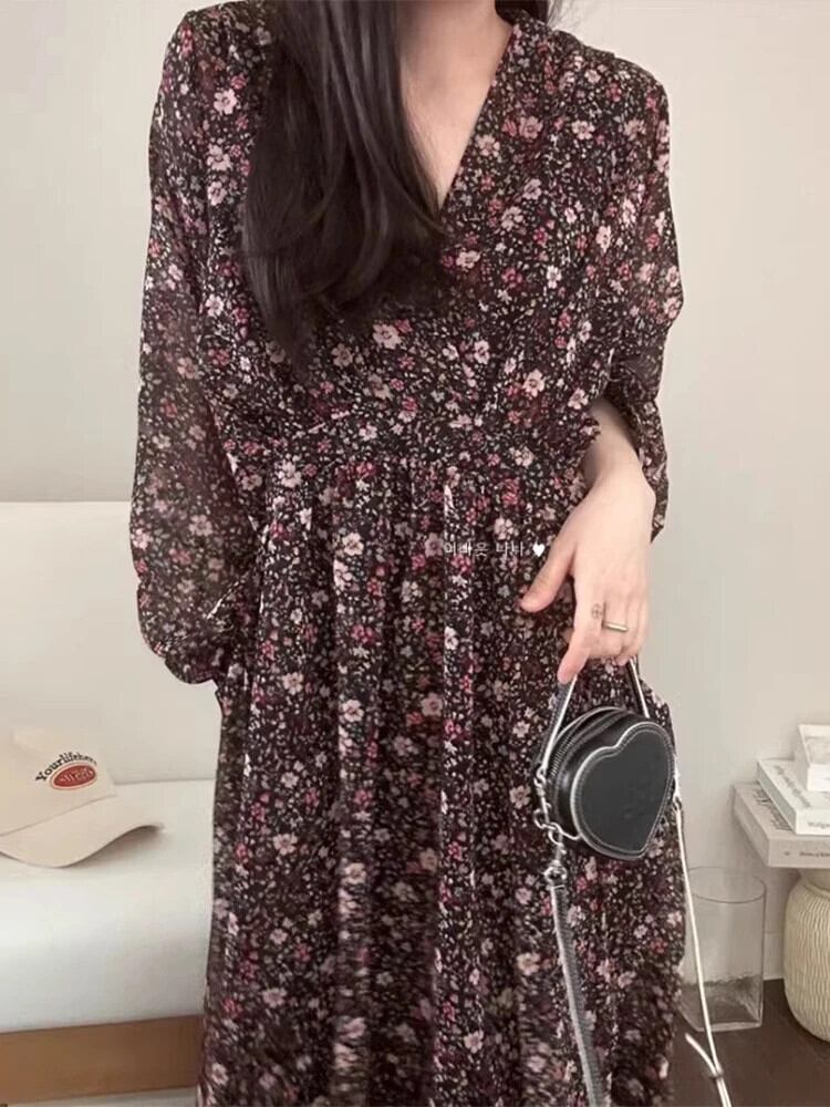 Nomikuma シック春甘い V ネックダブルポケット巾着ウエスト痩身シフォン花柄ドレス 2024 大人ガーリー スウィート キュート カジュアル スプリング 春物 Vネック