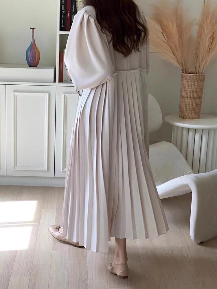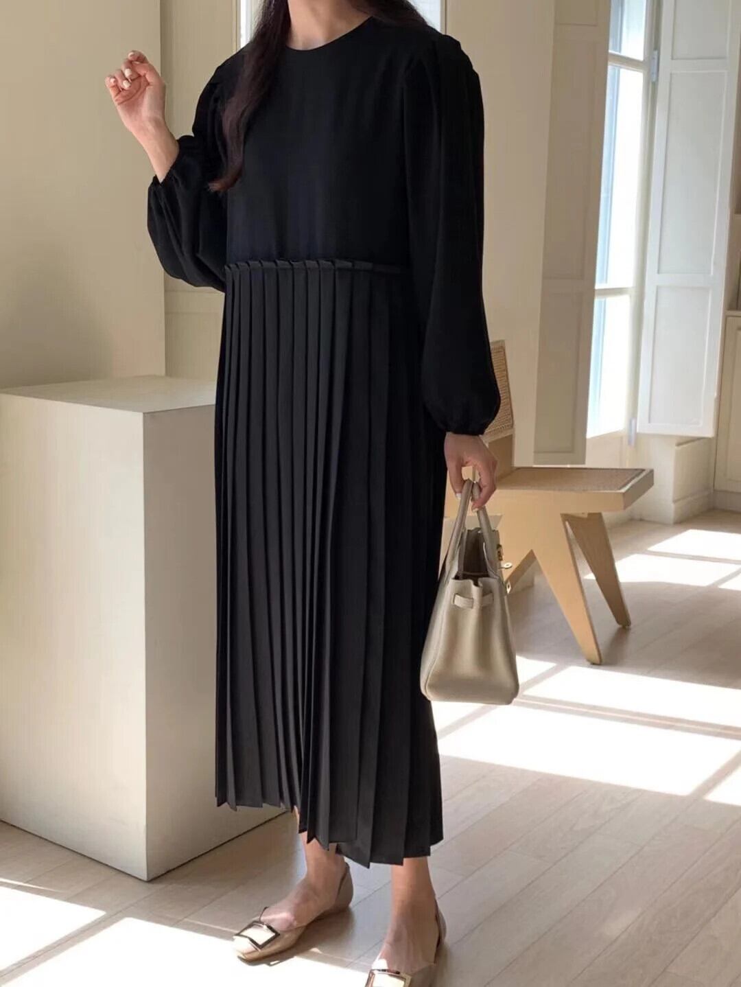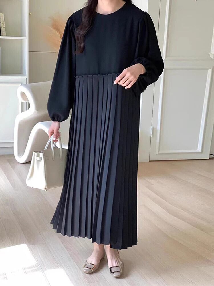 Nomikuma シック春ラウンドネック木製耳エッジスプライシングパフスリーブプリーツドレス スプリング 春物 Oネック