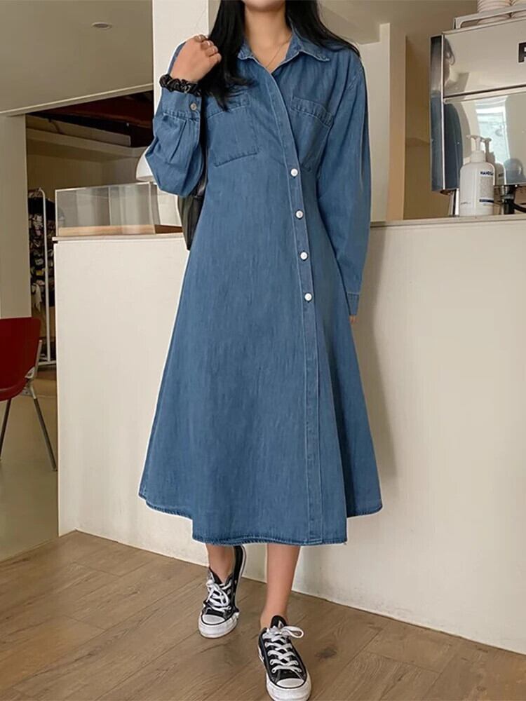 Nomikuma シック春ターンダウンカラー不規則シングルブレストスリムウエストウォッシュデニムドレス スプリング 春物