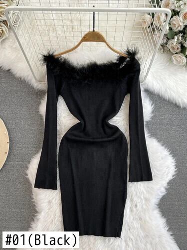 Nomikuma 長袖ファーパッチワークオフショルダーストラップレススリムウエストニットボディコーンドレス 2024 ロング