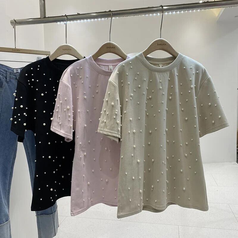 Nomikuma 2024 春ガール多用途半袖 Tシャツトップビーズ因果 O ネックグラフィック Tシャツ ショート ハーフスリーブ スプリング 春物 Oネック