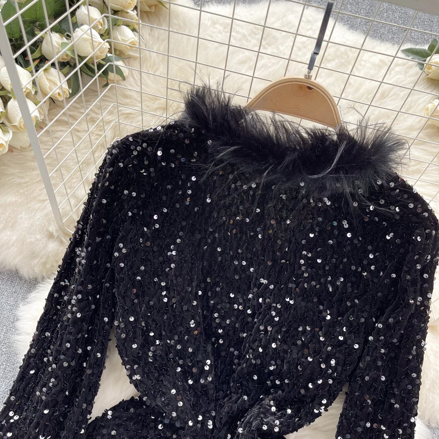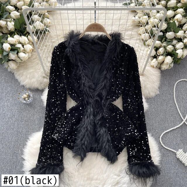 Nomikuma スパンコール Velet コート春 2024 スリムファーパッチワークカーディガンショールスパイシーガール Y2k トップ スプリング 春物