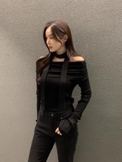 Nomikuma シック春多用途セクシーオフショルダースリムコントラストストライプボトムニットシャツプルオーバーニットトップス スプリング 春物
