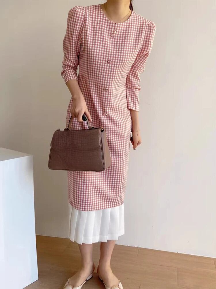 Nomikuma シック春レトロチェック柄コントラストカラーウエストラップ痩身プリーツドレスレディースロングドレス レッド スプリング 春物