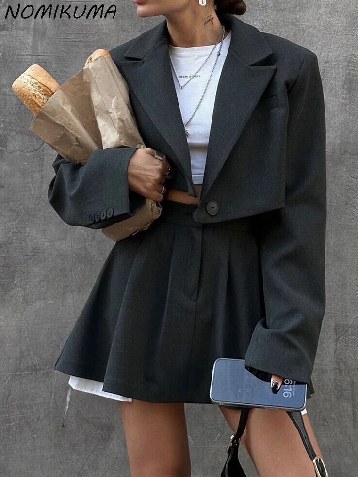 Nomikuma スーツミニスカートセット 2024 春 Y2K ショルダーノッチカラーショートスーツジャケット + ウエスト A ラインスカートスーツ衣装 スプリング 春物 Aライン