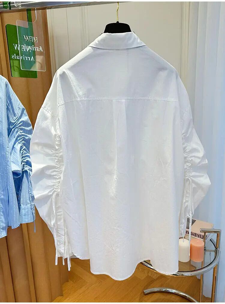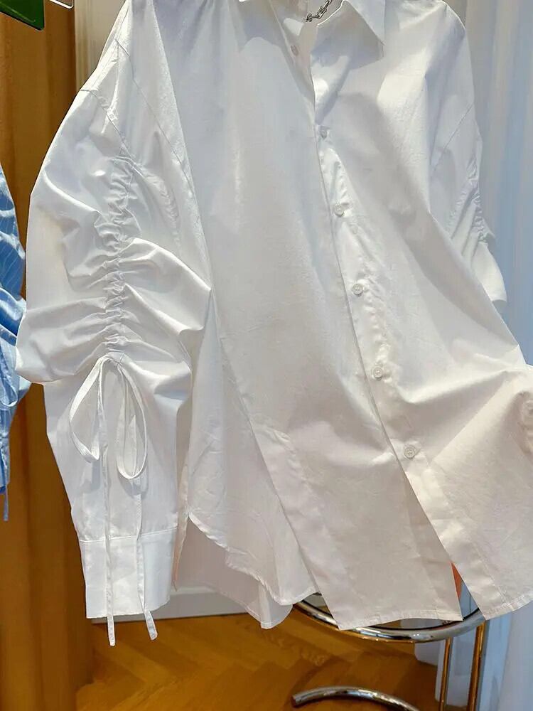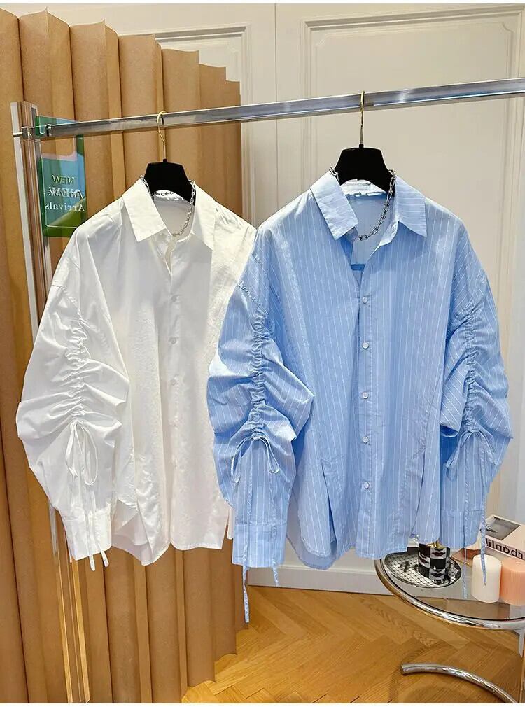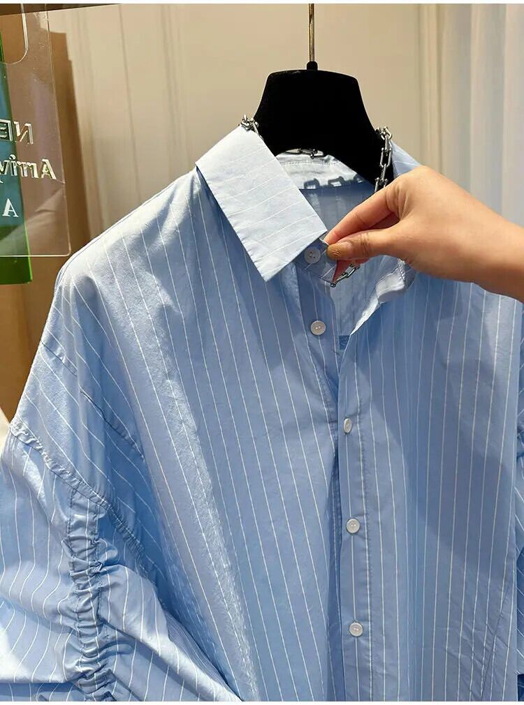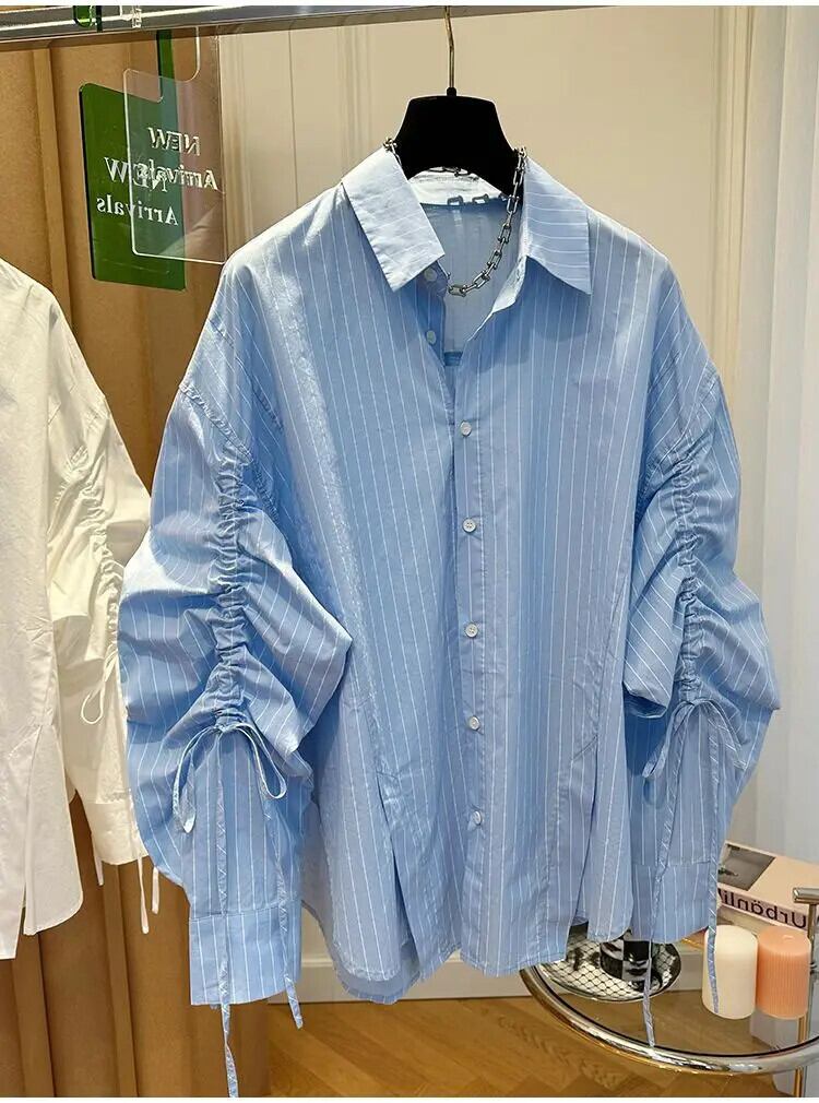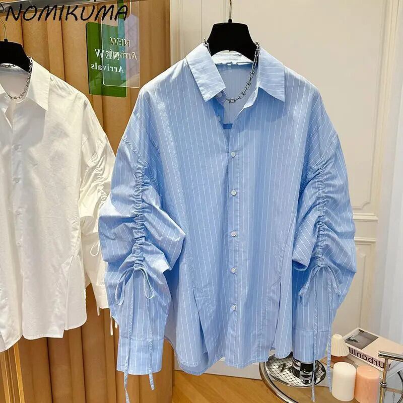 Nomikuma 2024 ニッチ長袖巾着ブルーストライプシャツ春スプリットヘムトップデ ロング スプリング 春物