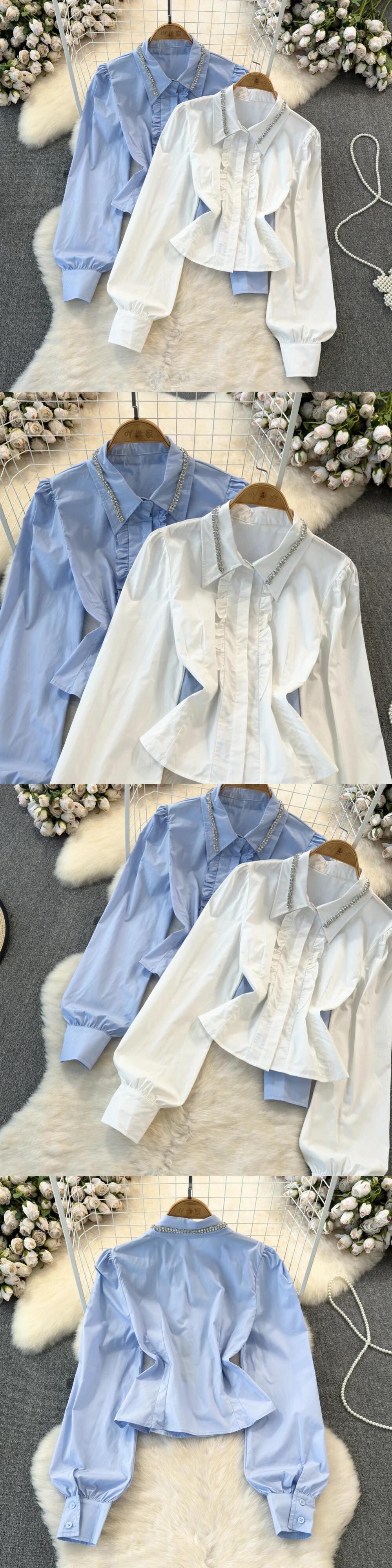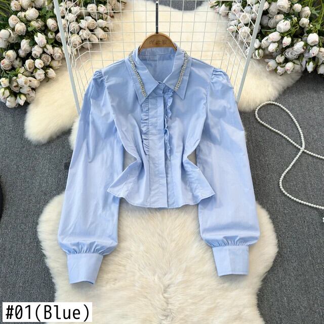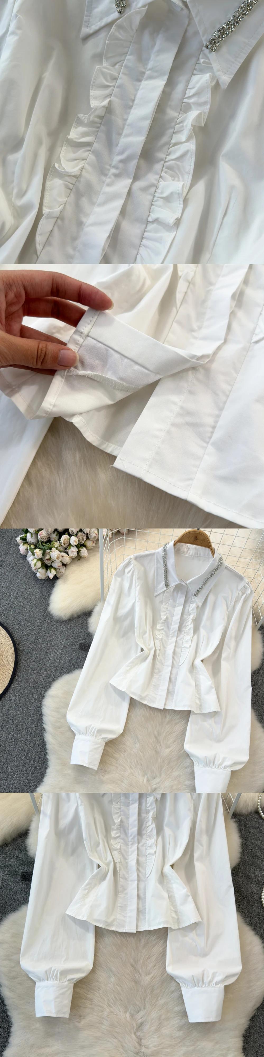 Nomikuma 春秋パフ長袖ダイヤモンドターンダウン襟フリルエッジシングルブレスト白シャツトップ ロング ホワイト スプリング 春物 オータム 秋物
