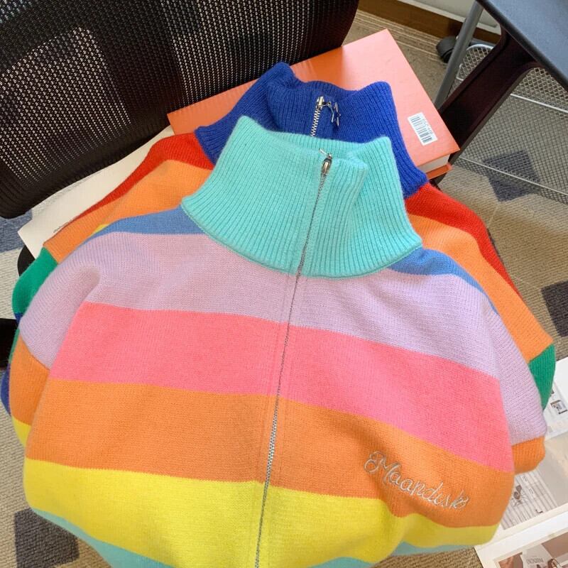 Nomikuma レインボーストライプセーターコートニットヒットカラージッパータートルネックカーディガン秋ニット生き抜くトップス オータム 秋物