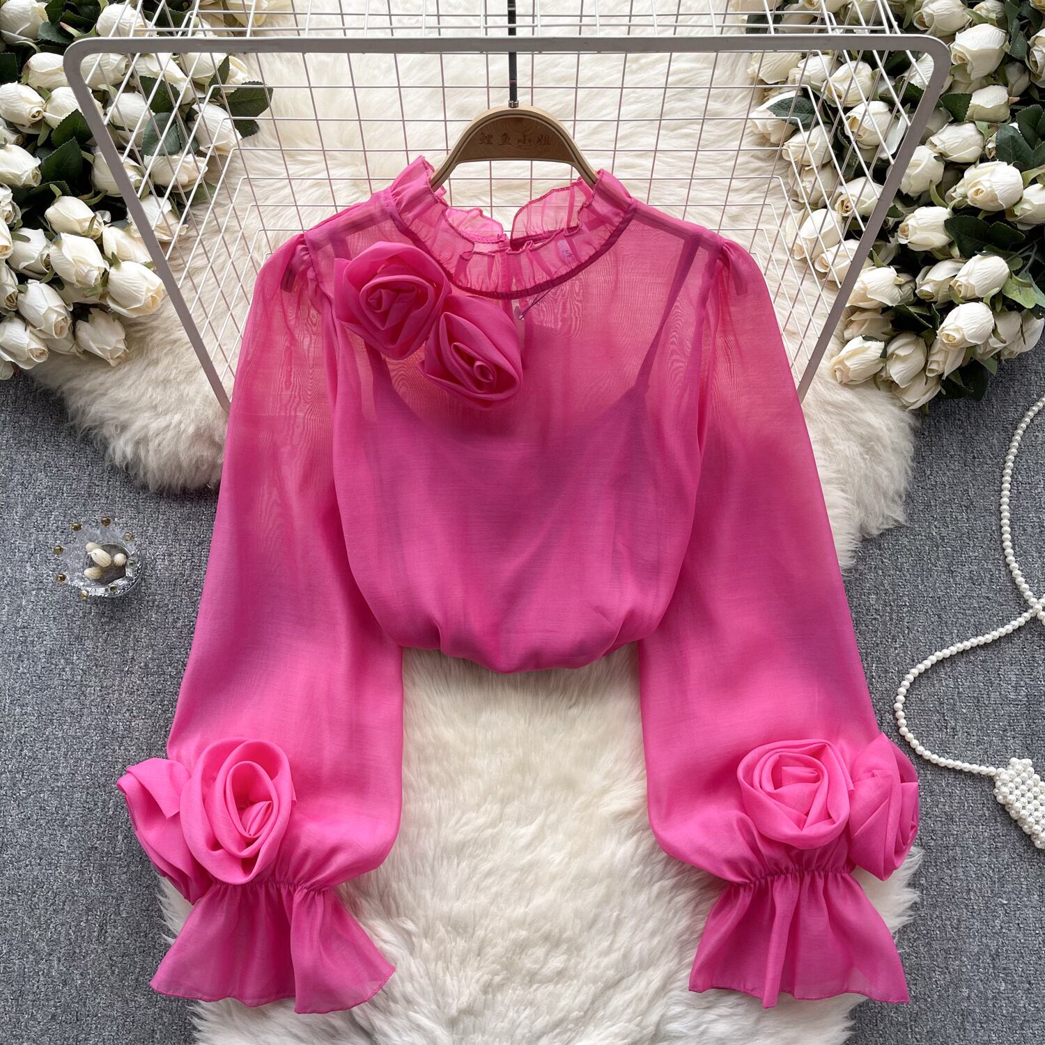 Nomikuma フレンチシフォンシャツ レディース 3D フラワー パフスリーブ 多用途 甘いフリル スタンドカラー プルオーバー トップス 大人ガーリー スウィート キュート カジュアル フラワーデザイン