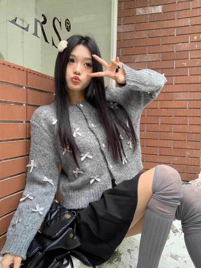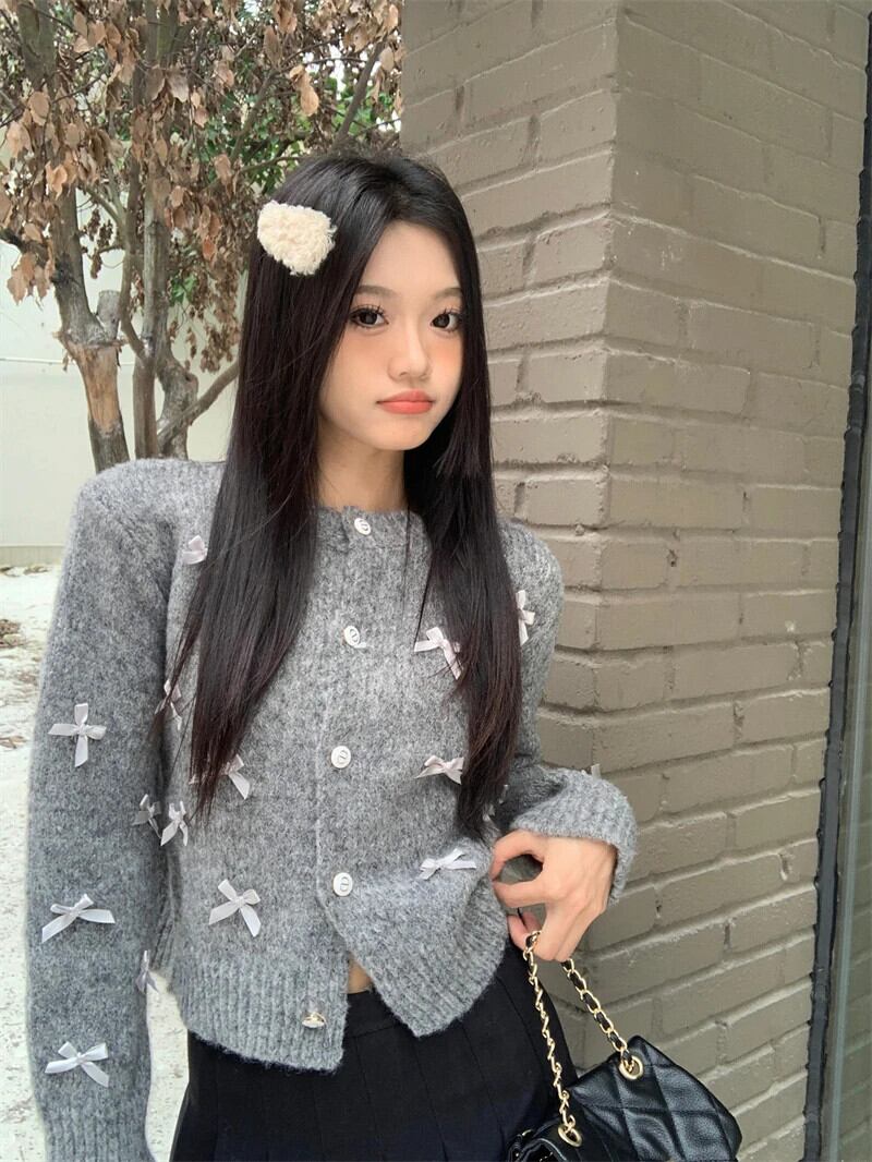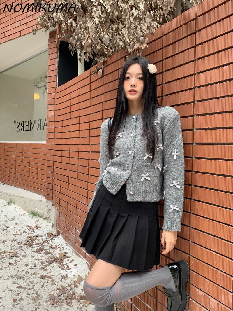 Nomikuma 弓グレーラウンドネックセータージャケット秋冬ニッチ長袖ニットカーディガントップ ロング リボン オータム 秋物 ウィンター 冬物 Oネック