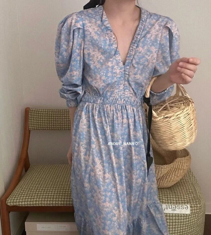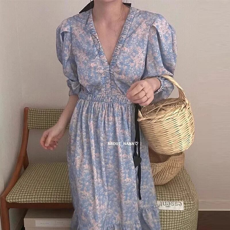 Nomikuma シック春 V ネックスリムウエストパフスリーブ花柄ドレス 2024 ロングドレス スプリング 春物 Vネック