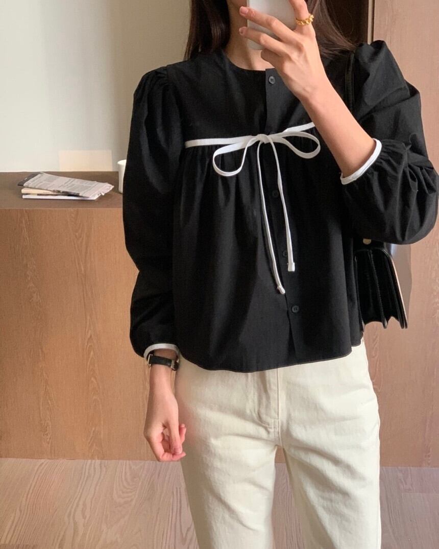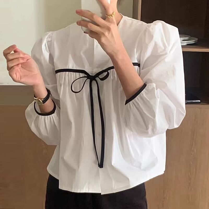 Nomikuma シック春ラウンドネックタイアップボウノットコントラストカラー因果多用途長袖シャツ ロング リボン スプリング 春物 Oネック