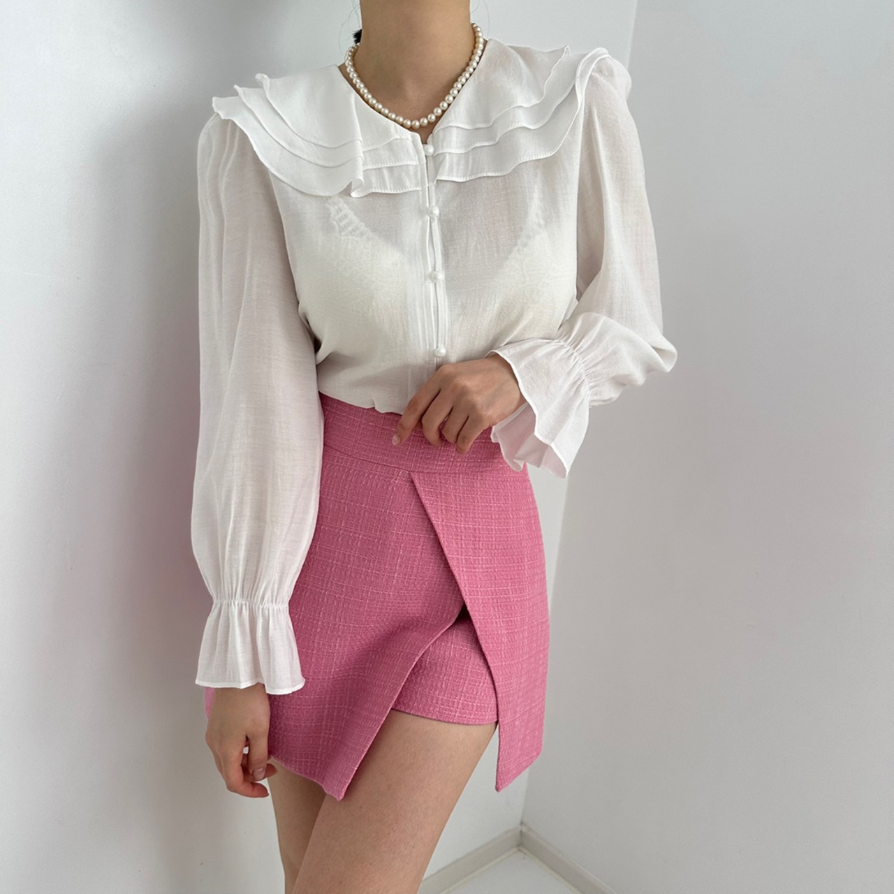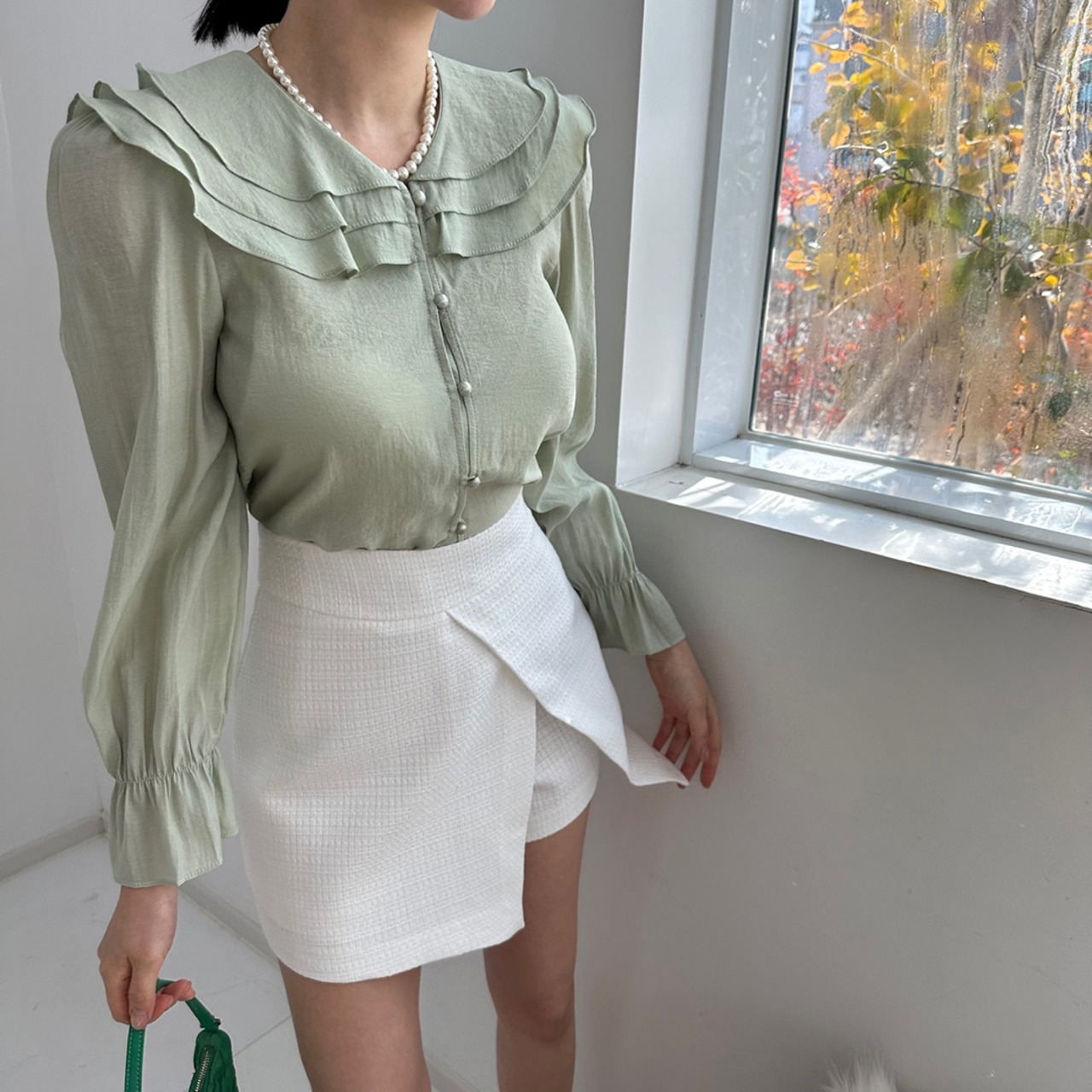 Nomikuma シック春甘いフリルエッジピーターパンカラーシングルブレスト多用途長袖シフォンシャツ ロング 大人ガーリー スウィート キュート カジュアル スプリング 春物