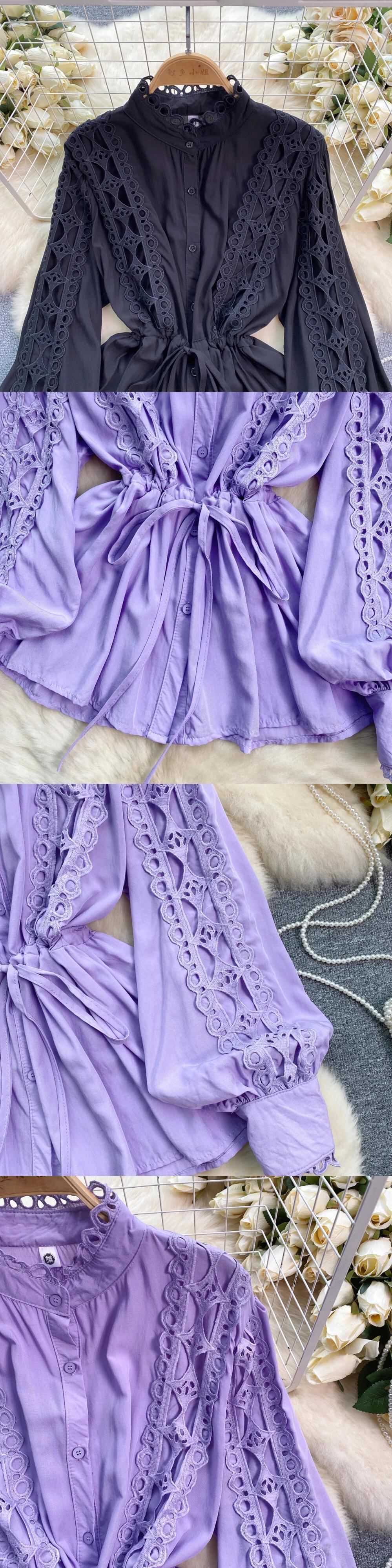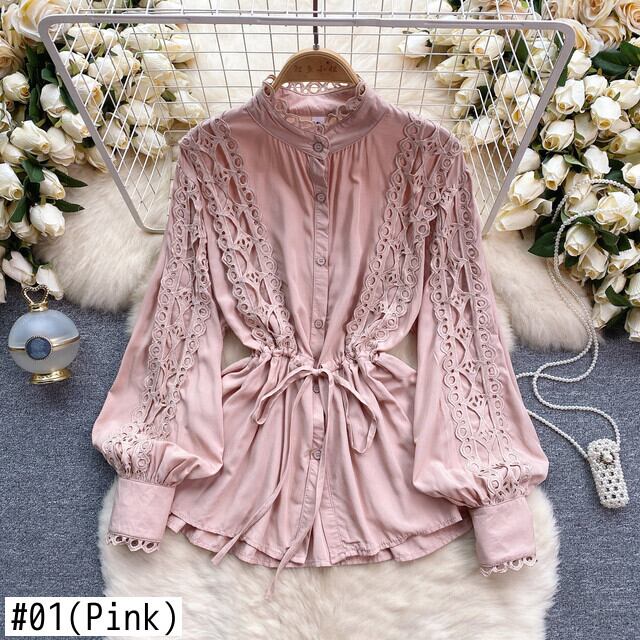 Nomikuma スイートレースフックパッチワークシャツレディース 2024 春巾着スリムウエスト長袖ブラウストップ ロング 大人ガーリー スウィート キュート カジュアル スプリング 春物