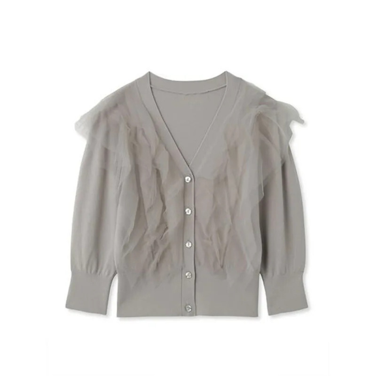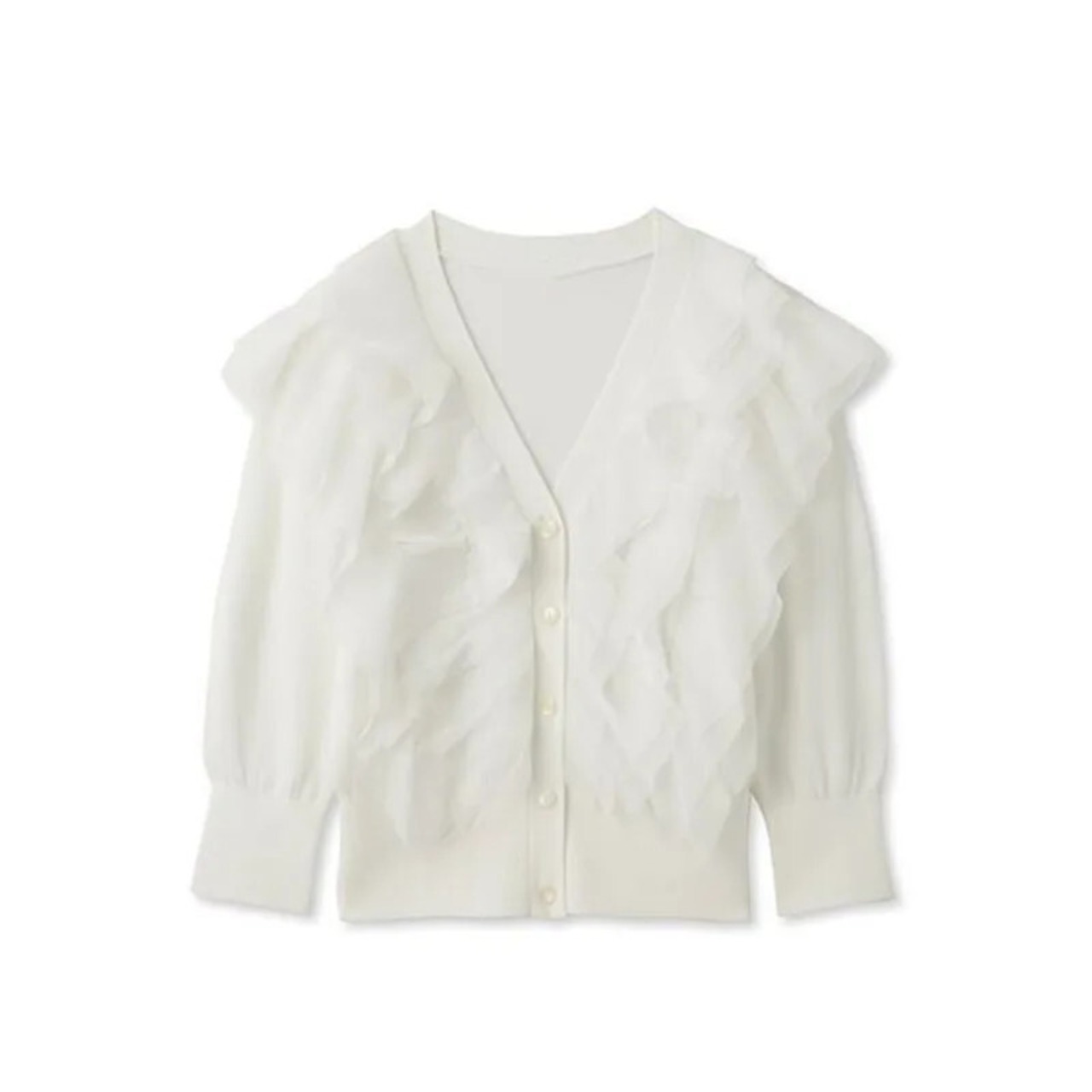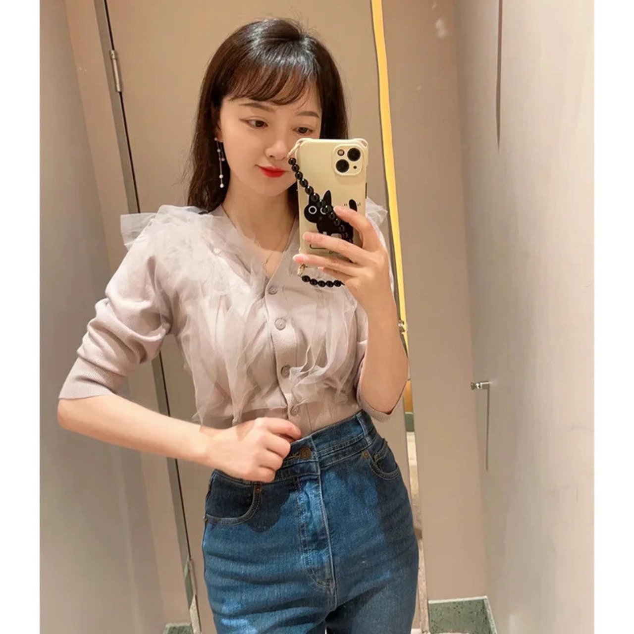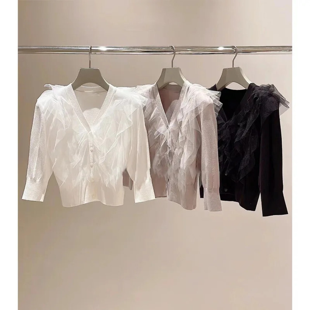 Nomikuma ese 2024 春 スウィート V ネック パフ スリーブ フリル エッジ スプライス ニット 七分袖 セーター トップス 大人ガーリー キュート カジュアル スプリング 春物 Vネック