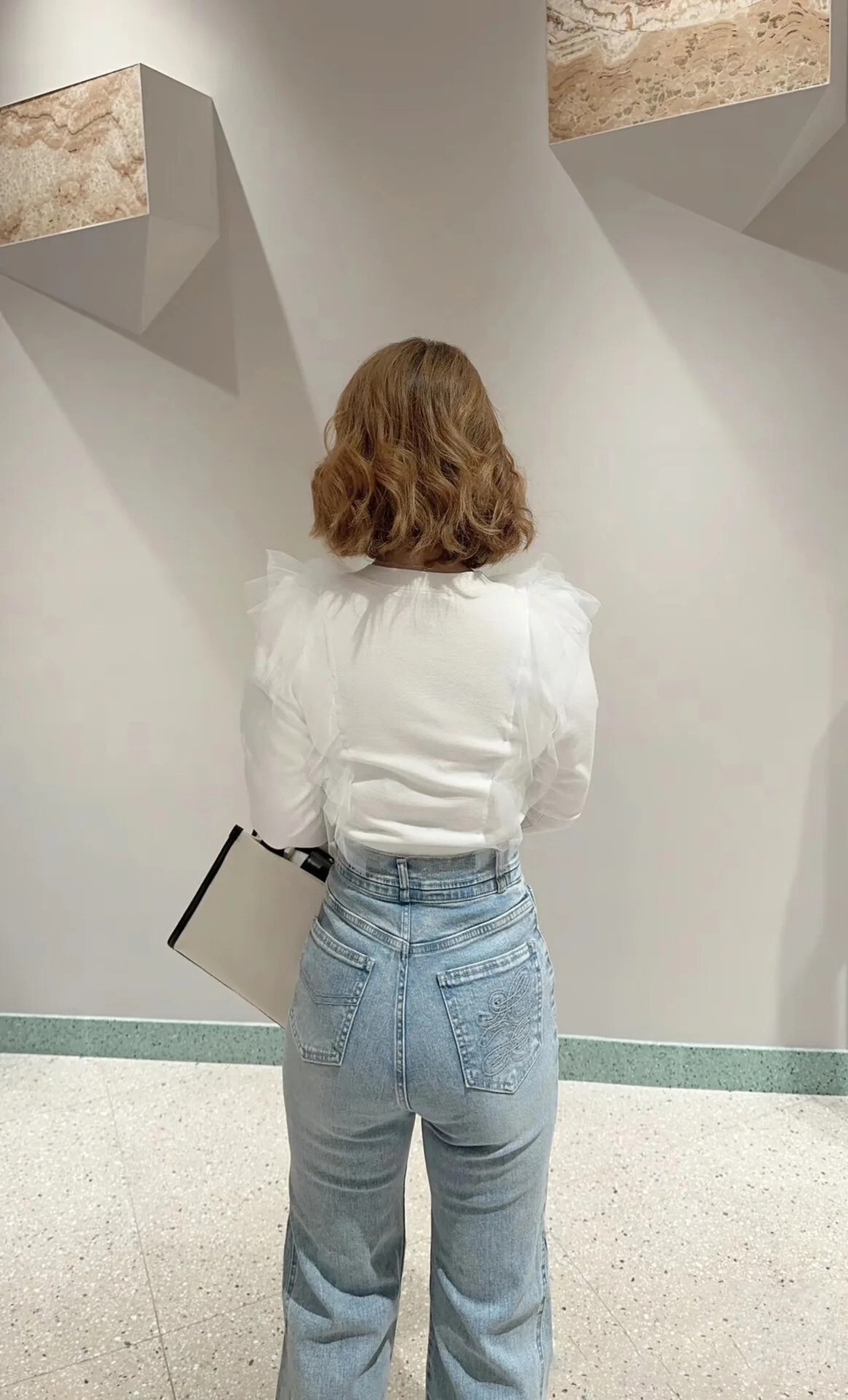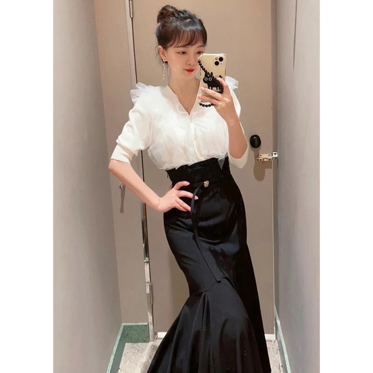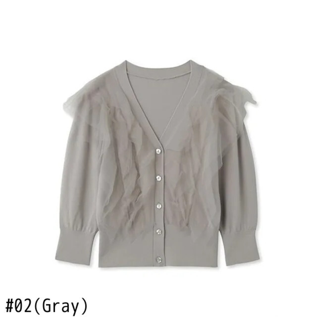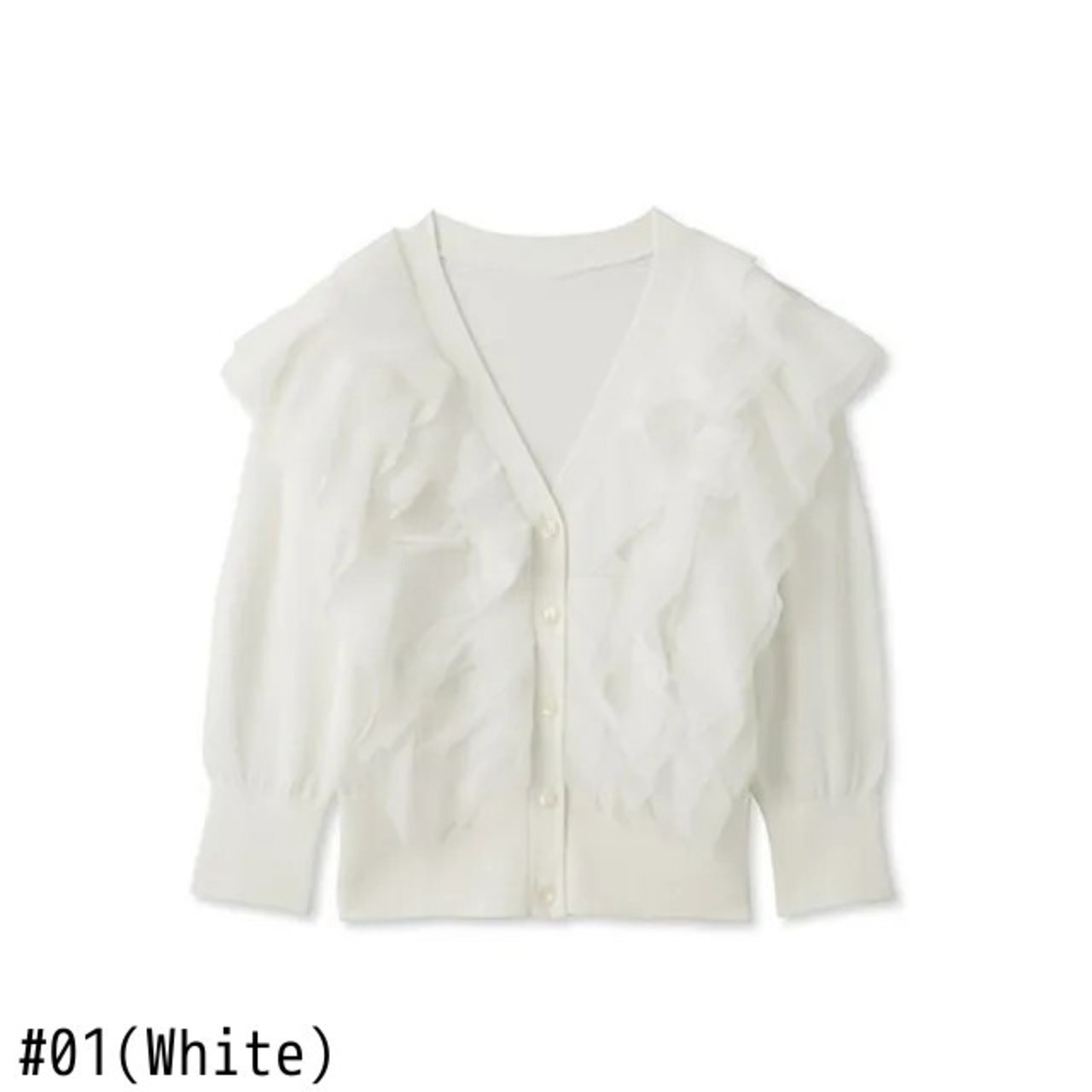 Nomikuma ese 2024 春 スウィート V ネック パフ スリーブ フリル エッジ スプライス ニット 七分袖 セーター トップス 大人ガーリー キュート カジュアル スプリング 春物 Vネック