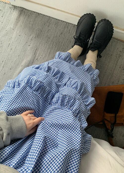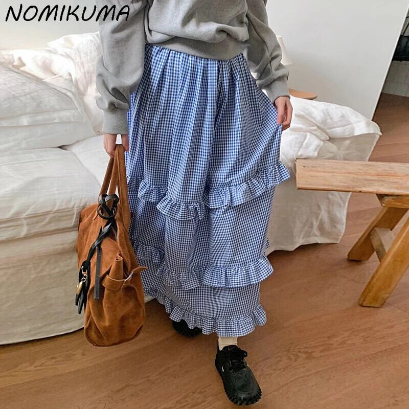 Nomikuma 春レトロ多用途ウエスト弾性パッチワーク木耳エッジコントラストチェックケーキスカート 5 分丈スカート レッド エラスティック 伸縮 スプリング 春物