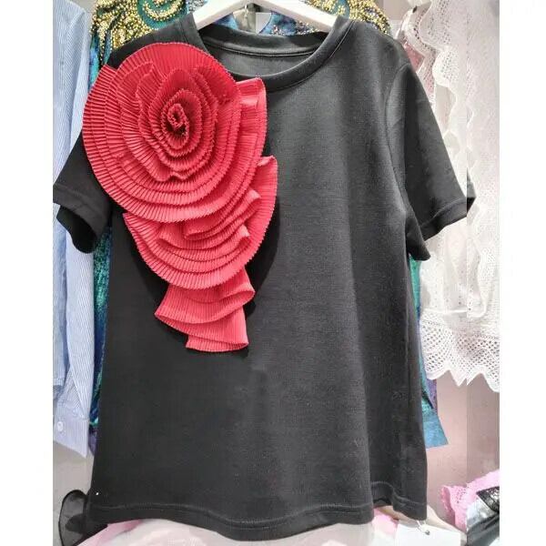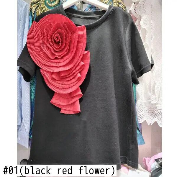 Nomikuma 2024 春夏 プリーツ 3D レッドフラワー 半袖 Tシャツ レディース 万能トップス ショート ハーフスリーブ スプリング 春物 サマー 夏物 フラワーデザイン