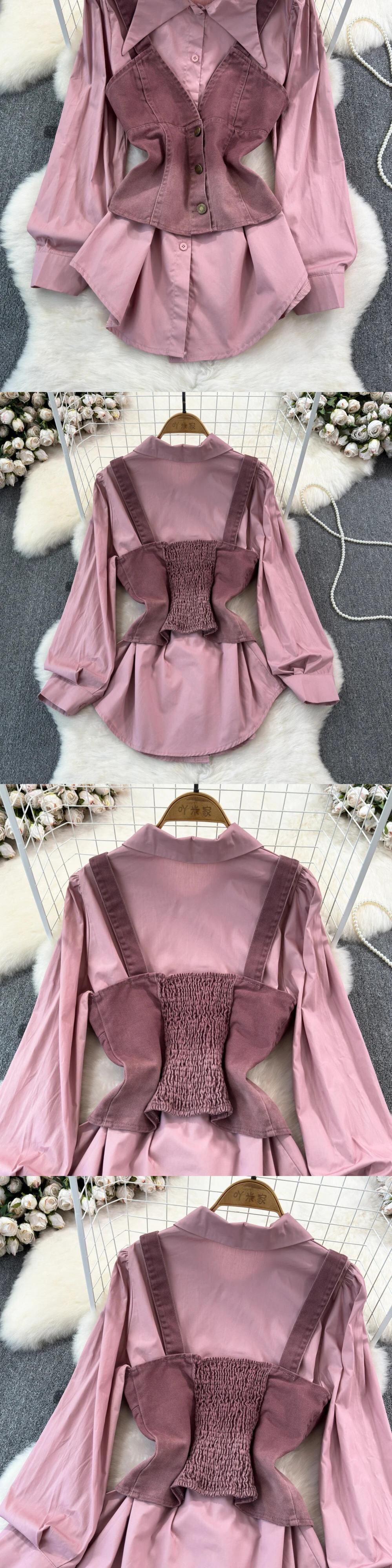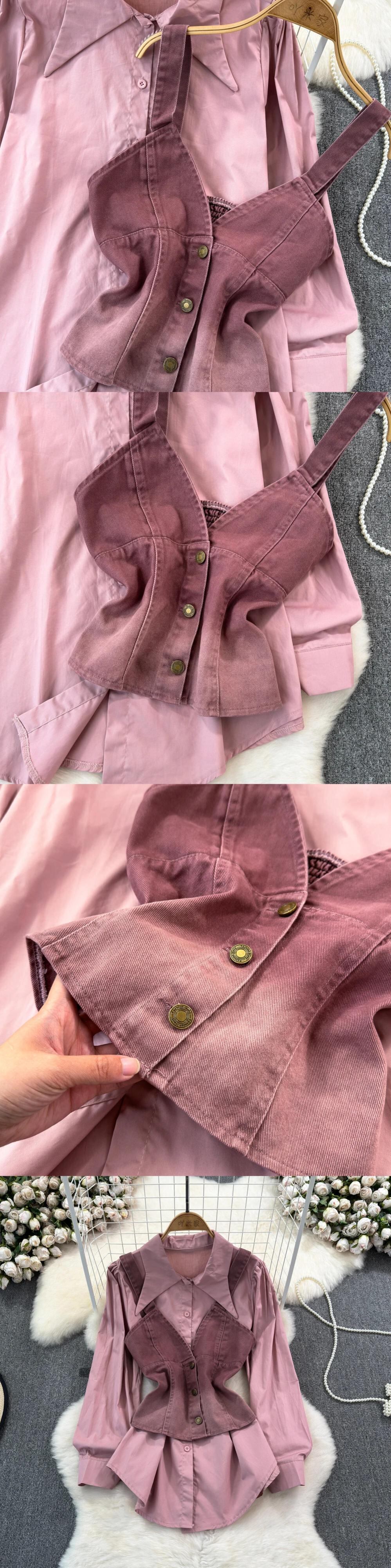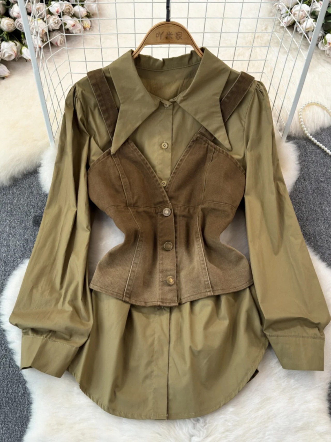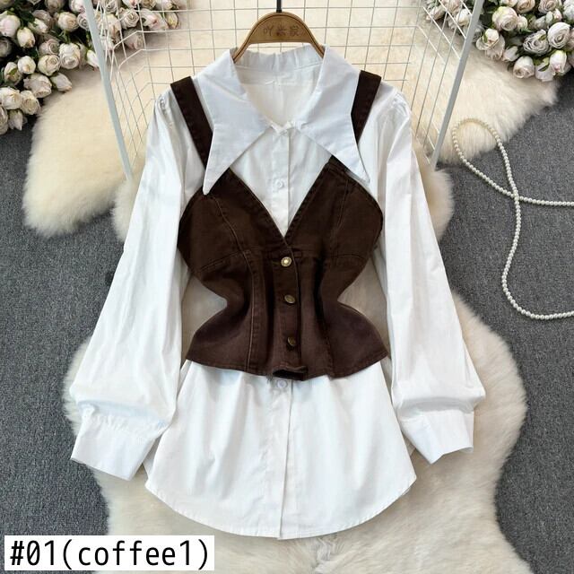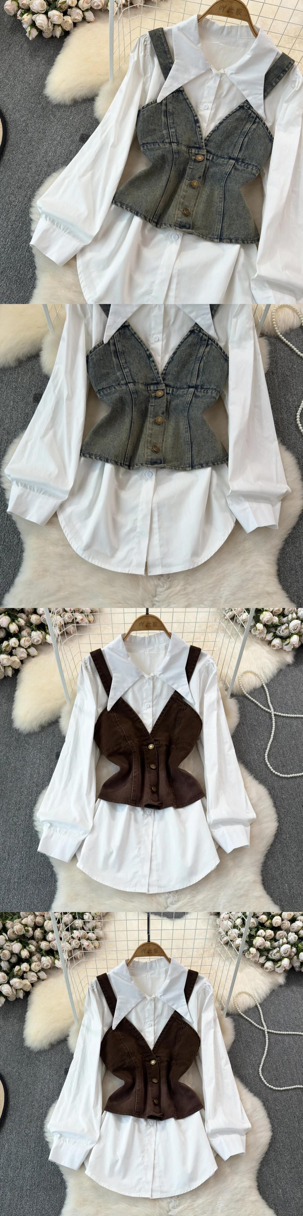 Nomikuma 秋ニッチスプライシングウエスト引き締めスリムフィット万能デニムベストシャツ 2 点セット オータム 秋物