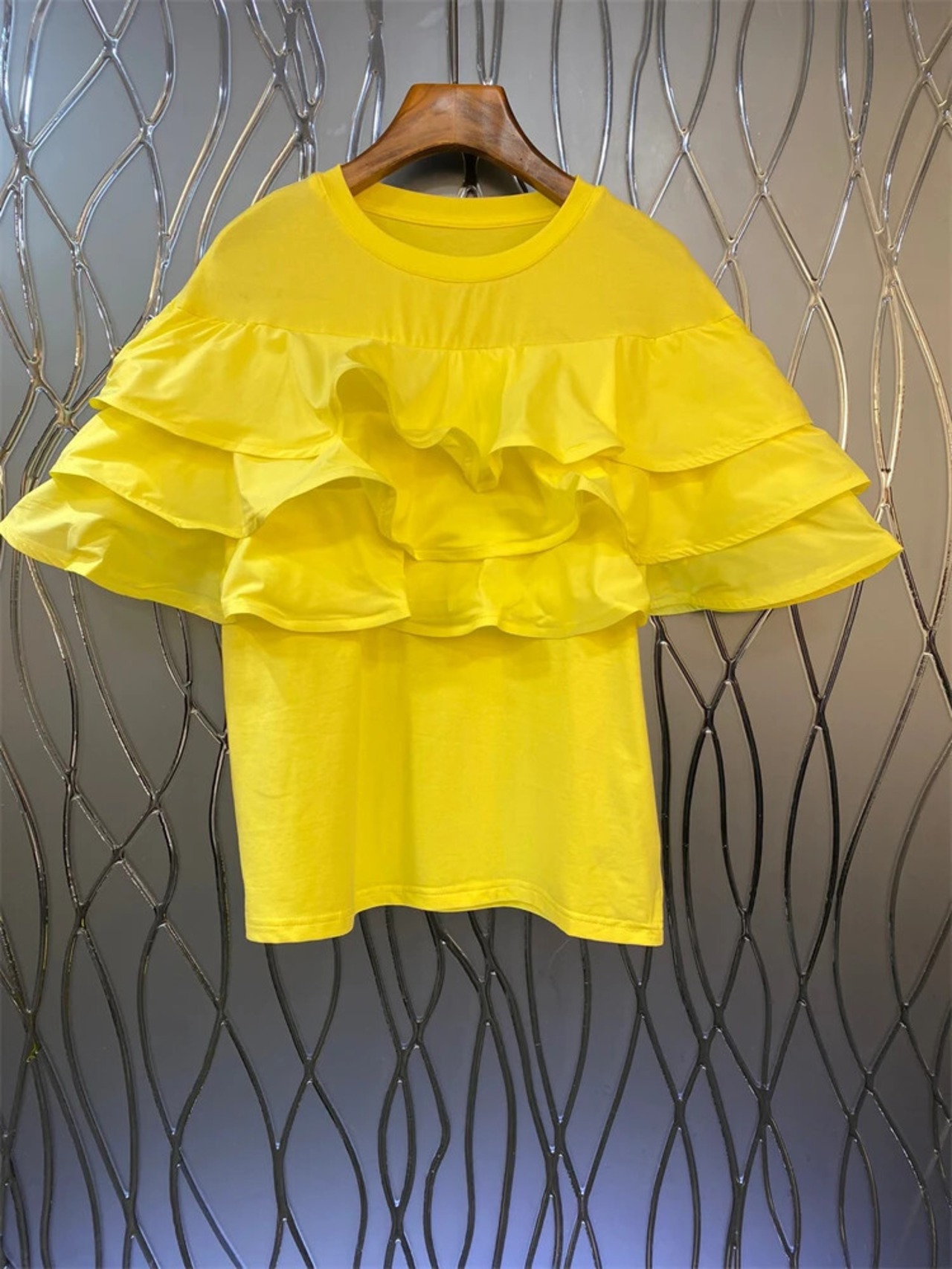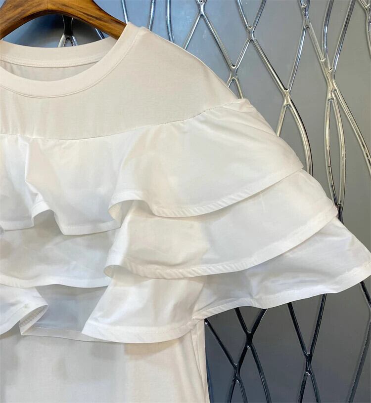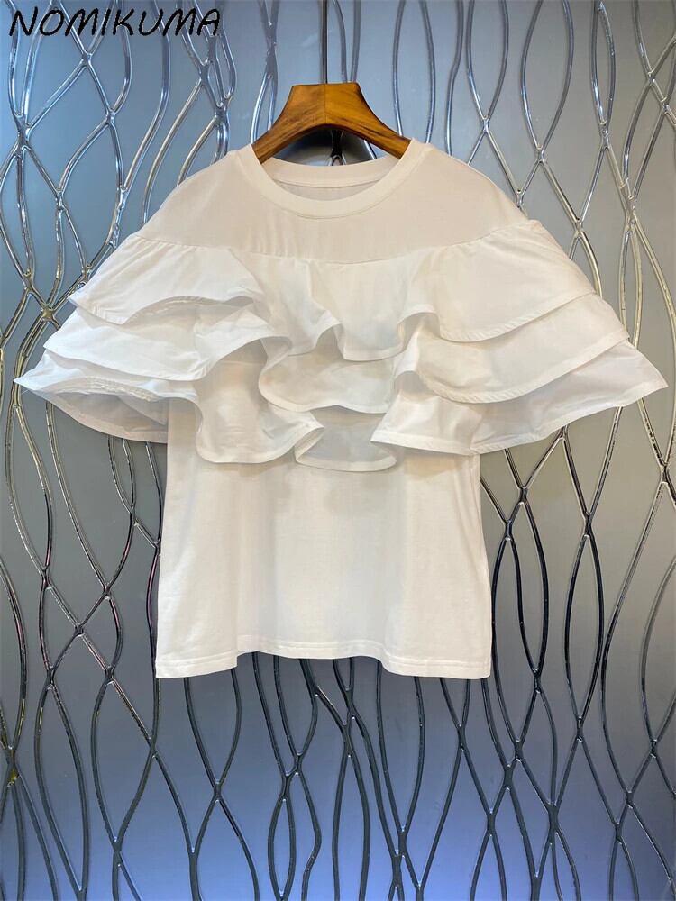 Nomikuma レイヤード フリル エッジ パッチワーク ラウンドネック 半袖 Tシャツ レディース 2024 夏 無地 トップス ショート レッド ハーフスリーブ サマー 夏物 Oネック ソリッドカラー