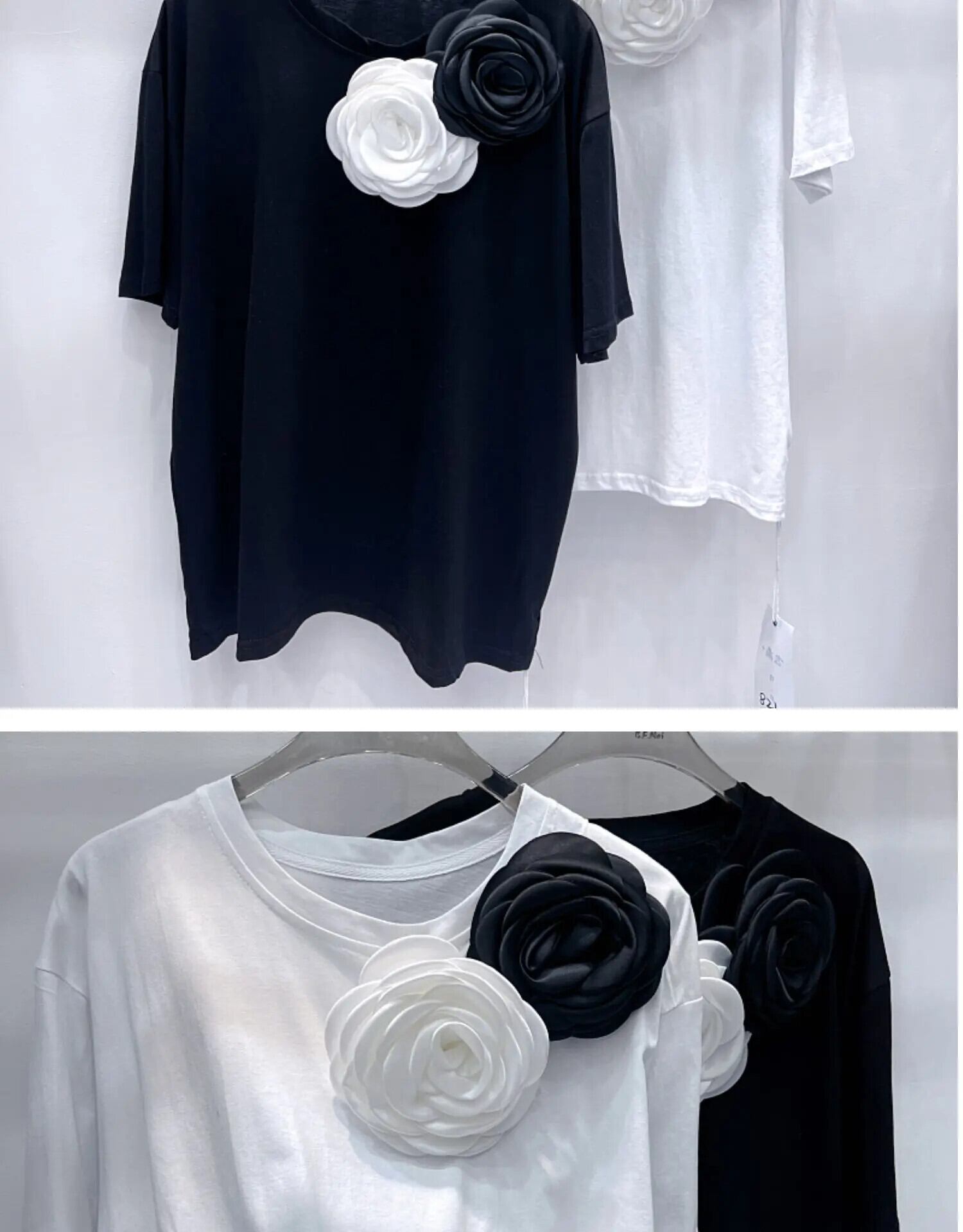 Nomikuma 2024 夏ニッチ 3D フラワーラウンドネック半袖トップレディース多用途 Tシャツ ショート ハーフスリーブ サマー 夏物 Oネック フラワーデザイン