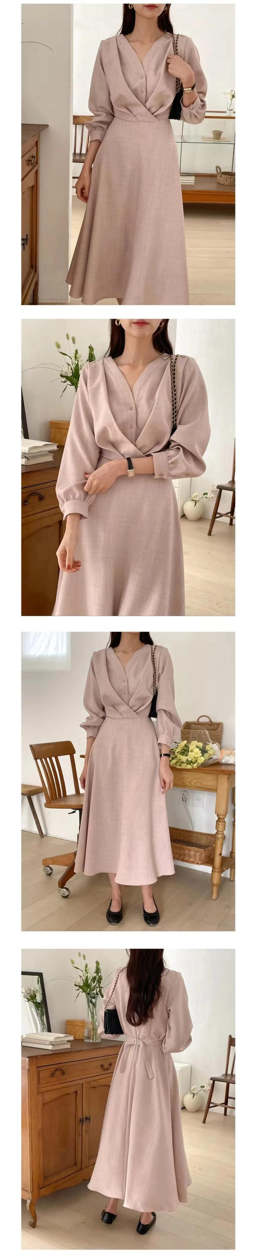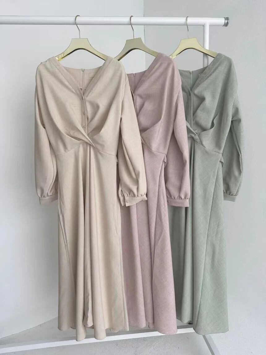 Nomikuma シック春レトロスタイル V ネック シングルブレスト プリーツ タイアップ ウエスト痩身長袖ドレス ロング スプリング 春物 Vネック