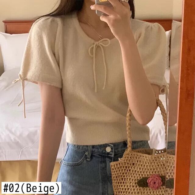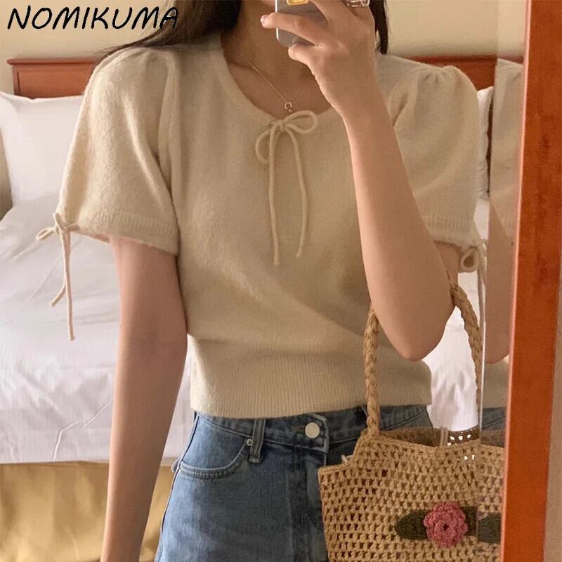 Nomikuma シック夏蝶ネクタイパフスリーブニットセーターニッチショートスリムウエストニットトップ リボン サマー 夏物