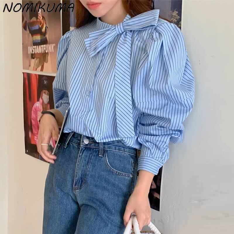 Nomikuma シック春レトロ立ちネックリボン多用途長袖ストライプシャツトップス ロング スプリング 春物