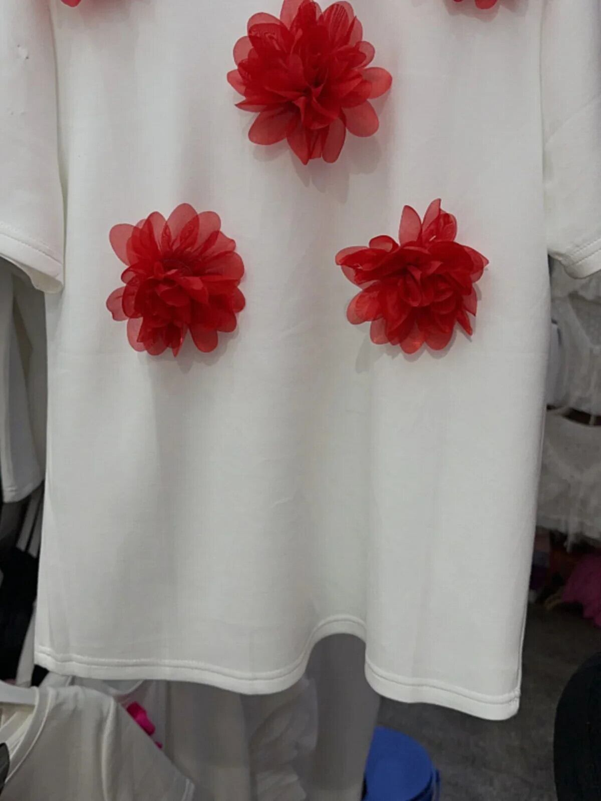 Nomikuma 2024 夏可能 コントラストカラー D フラワー ラウンドネック 半袖 Tシャツ レディース トップス ショート ハーフスリーブ サマー 夏物 Oネック フラワーデザイン