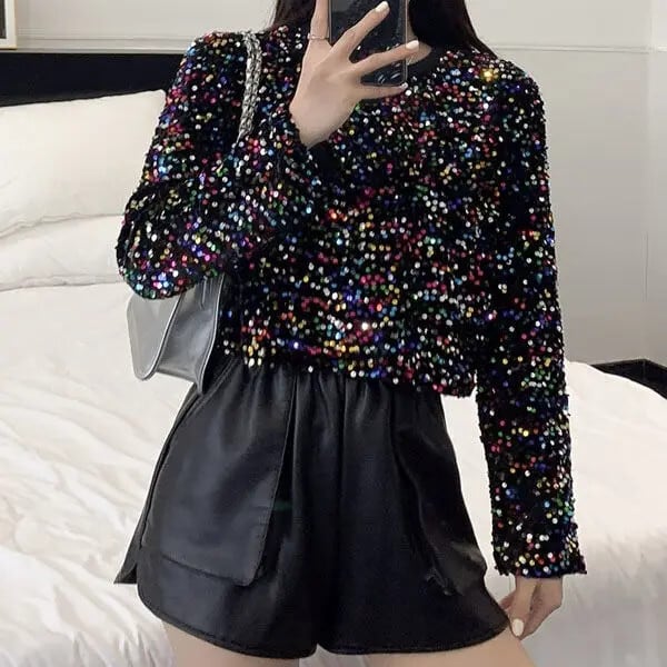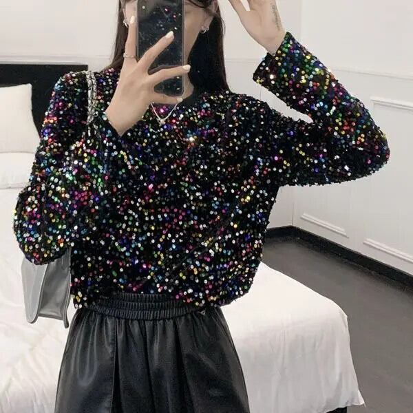 [ノミクマ] スパンコール ショート シャツ トップス レディース 2024 春 アボトム 長袖 Tシャツ Ropa De ロング スプリング 春物