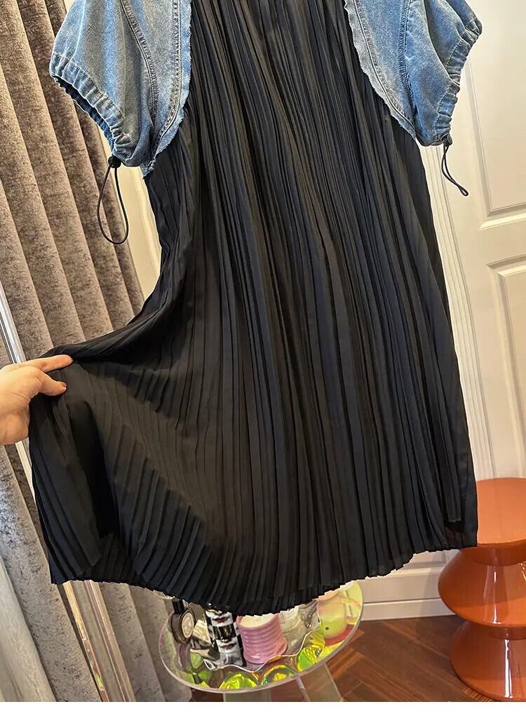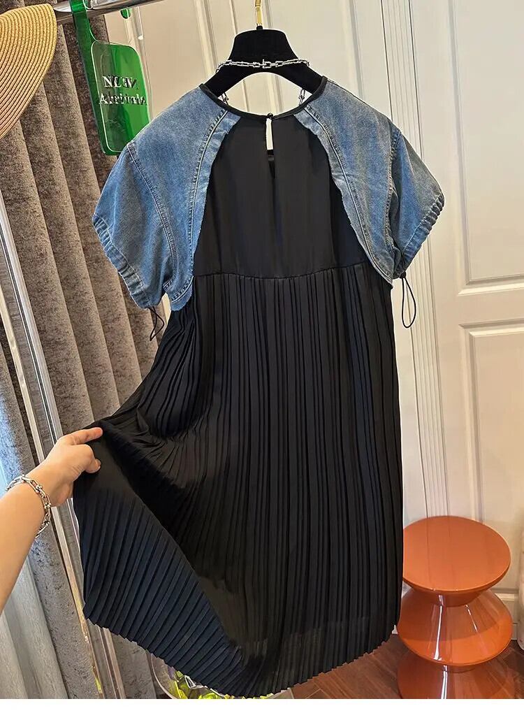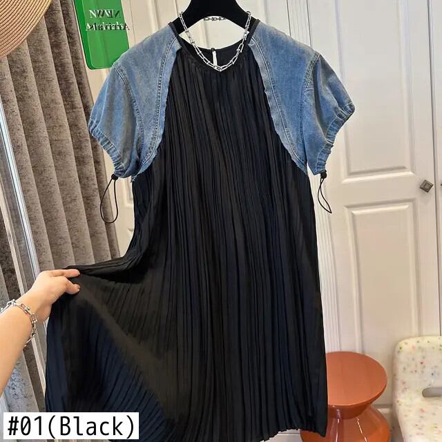 Nomikuma デニムパッチワークプリーツドレス A ラインミディアム丈ドレス半袖巾着ニッチ夏 Vestidos ショート ハーフスリーブ サマー 夏物 Aライン