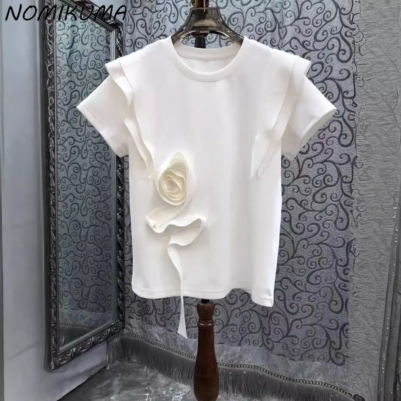 Nomikuma 2024 夏 レディース 3D フラワー フリル エッジ ソリッド ラウンドネック 半袖 万能 Tシャツ ショート ハーフスリーブ サマー 夏物 Oネック ソリッドカラー フラワーデザイン