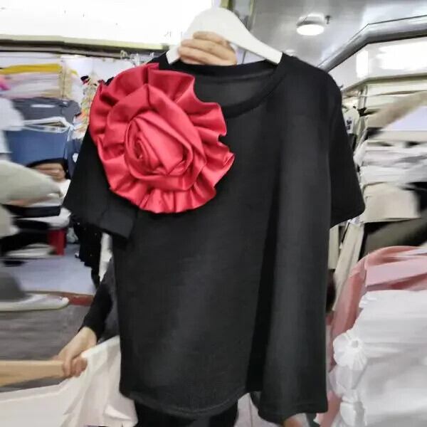 Nomikuma 2024 夏ニッチ半袖 Tシャツ 3D ローズフラワートップ Caiusal ラウンドネックグラフィック Tシャツ ショート ハーフスリーブ サマー 夏物 Oネック フラワーデザイン