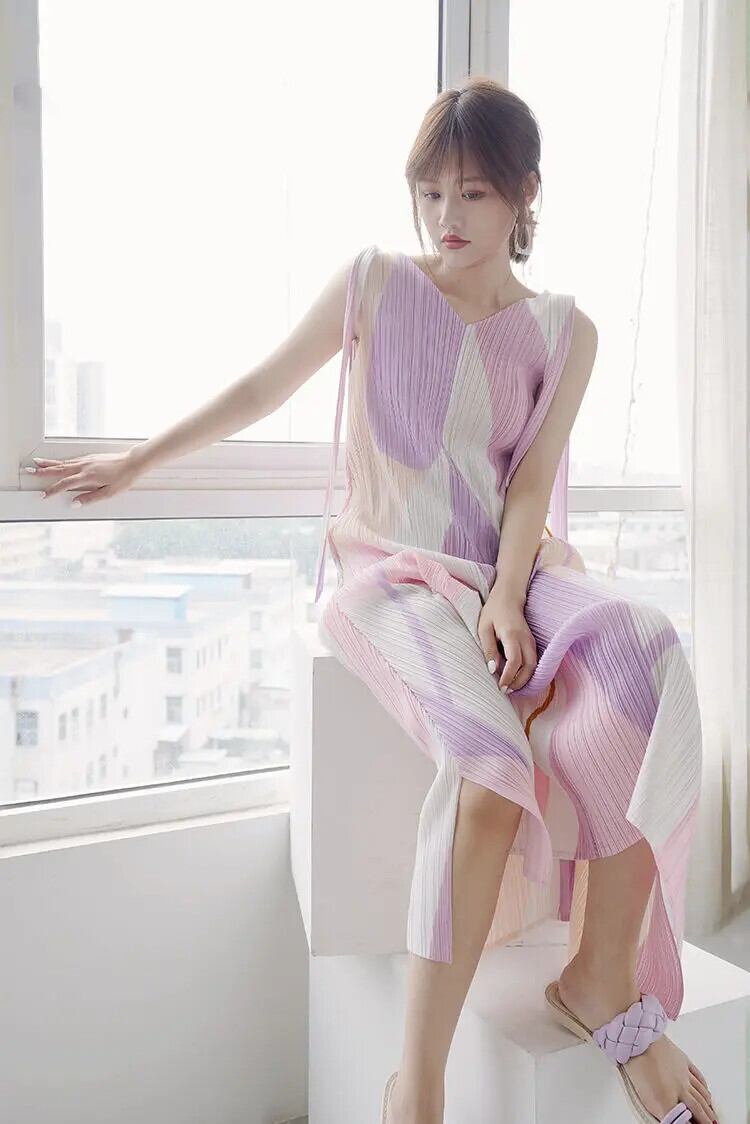 Nomikuma レディース ノースリーブ プリーツ ロング スプリット ドレス 夏 2024 対照的カラー V ネック ストラップ ドレス サマー 夏物 Vネック