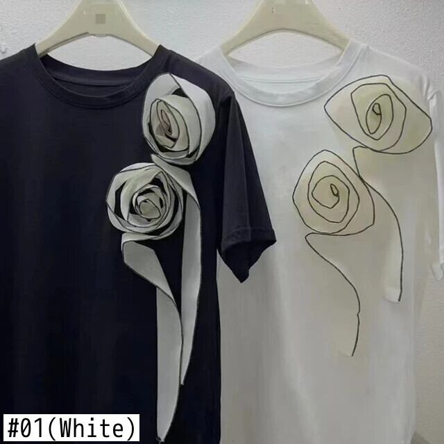 Nomikuma 3D 花パッチワークラウンドネック Tシャツ 2024 夏フレンチ半袖トップグラフィック Tシャツ ショート ハーフスリーブ サマー 夏物 花柄 Oネック