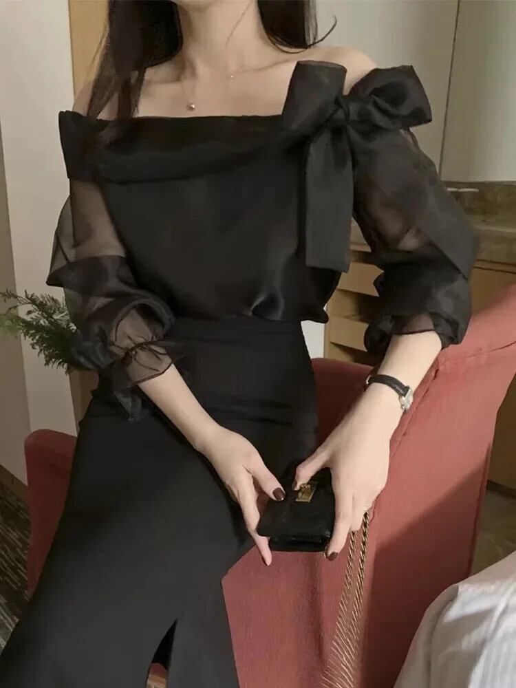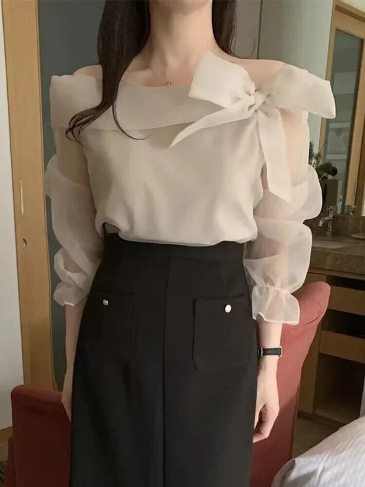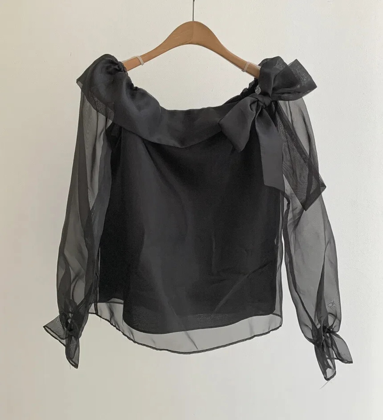 Nomikuma シック春オフショルダー蝶ネクタイフレア袖メッシュシャツトップ 2024 シャツ フレアスリーブ リボン スプリング 春物