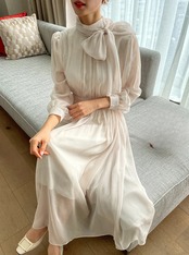 Nomikuma シック春スタイル スタンドネック リボン タイアップ ウエスト着痩せ 長袖 シフォン ロングドレス スプリング 春物