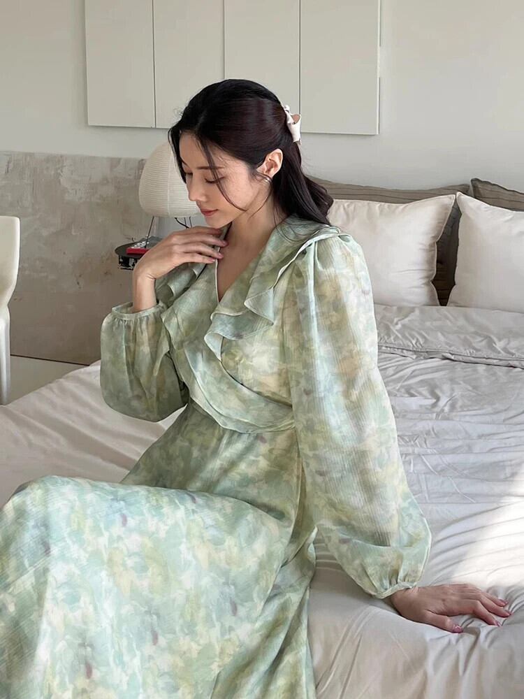 Nomikuma シック春フレンチ二重層ロータスカラーレースアップウエスト痩身長袖花柄ドレス ロング スプリング 春物