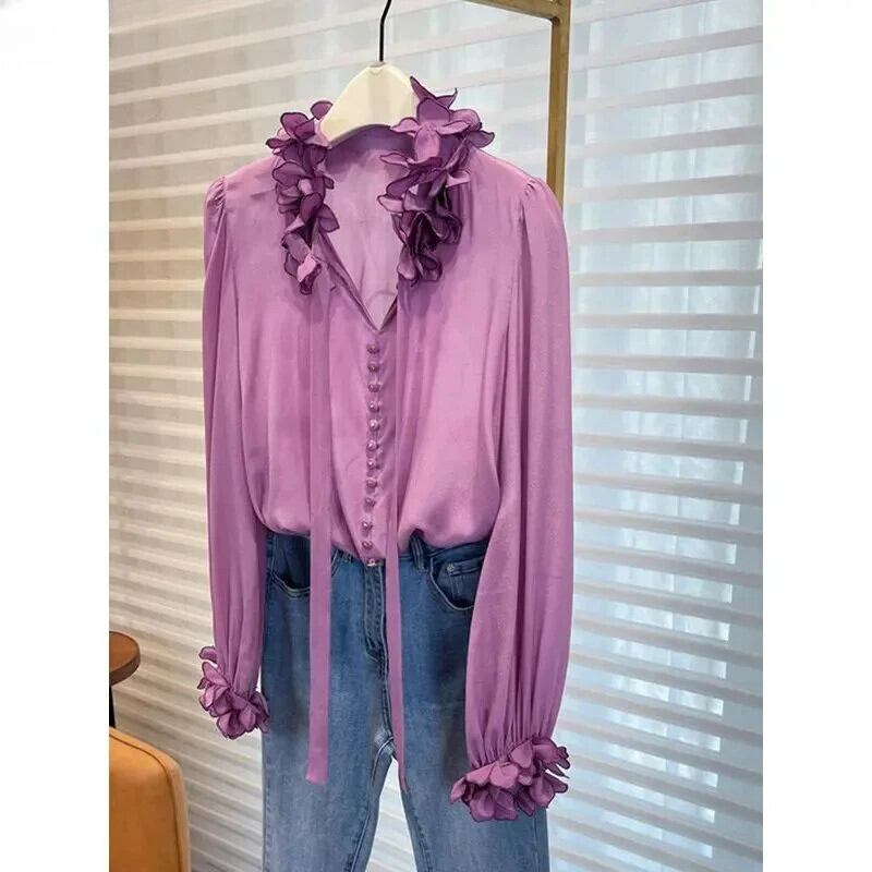Nomikuma レディース シック花びら襟シャツ 秋 長袖リボン ブラウス トップス ロング オータム 秋物