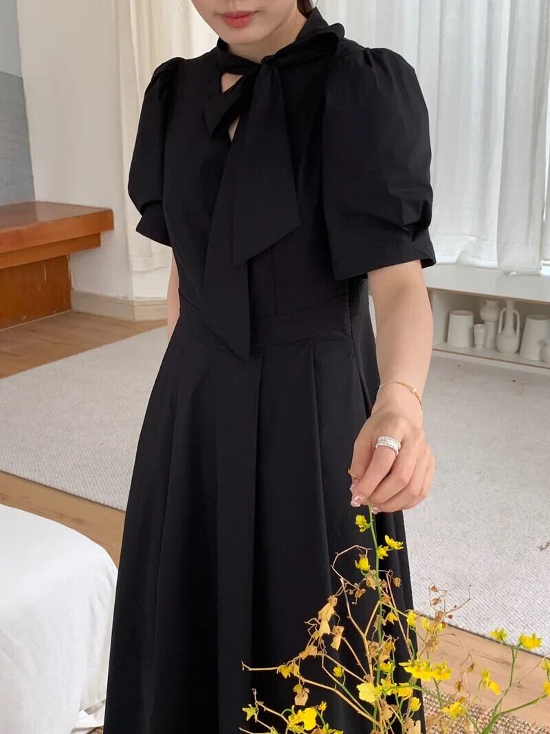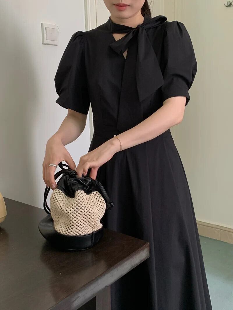 Nomikuma シック 2024 夏フレンチレトロ V ネックネクタイ弓痩身ウエストパフ半袖ロングドレス ショート リボン ハーフスリーブ サマー 夏物 Vネック