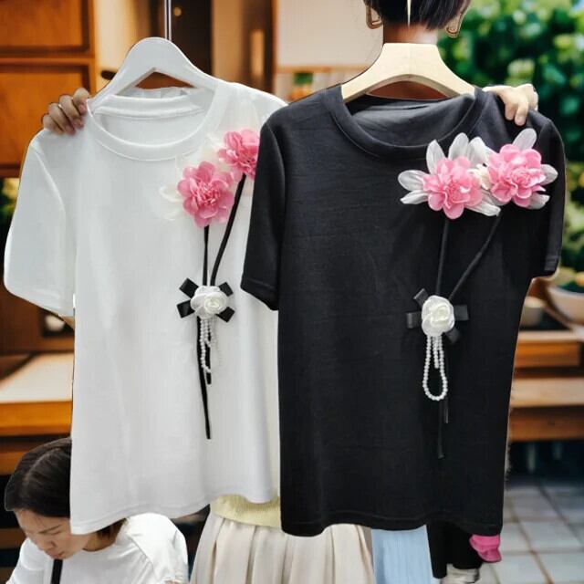 Nomikuma ビーズ コントラストカラー スイート 3D フラワー ラウンドネック 半袖 Tシャツ レディース 春夏 ボトム トップ ショート ハーフスリーブ 大人ガーリー スウィート キュート カジュアル スプリング 春物 サマー 夏物 Oネック フラワーデザイン