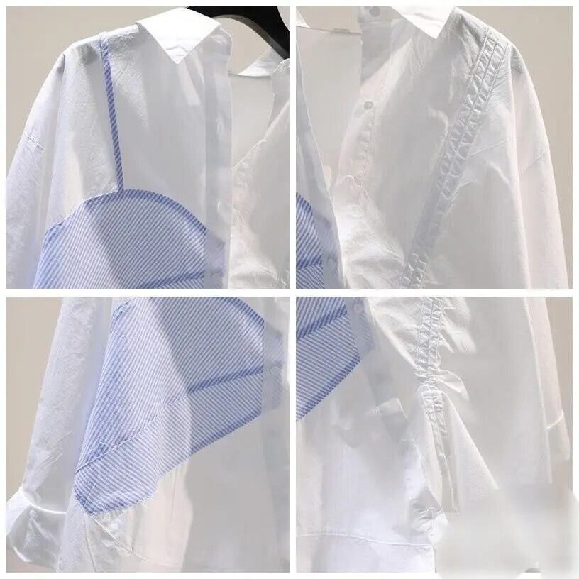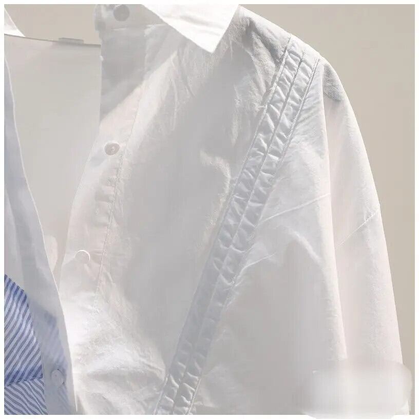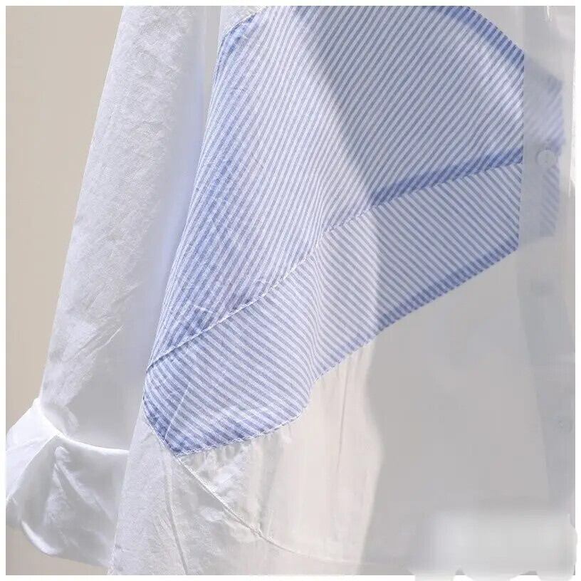 Nomikuma 2024 春秋ブルーストライプパッチワーク白因果シャツターンダウン襟ブラウストップス ホワイト スプリング 春物 オータム 秋物
