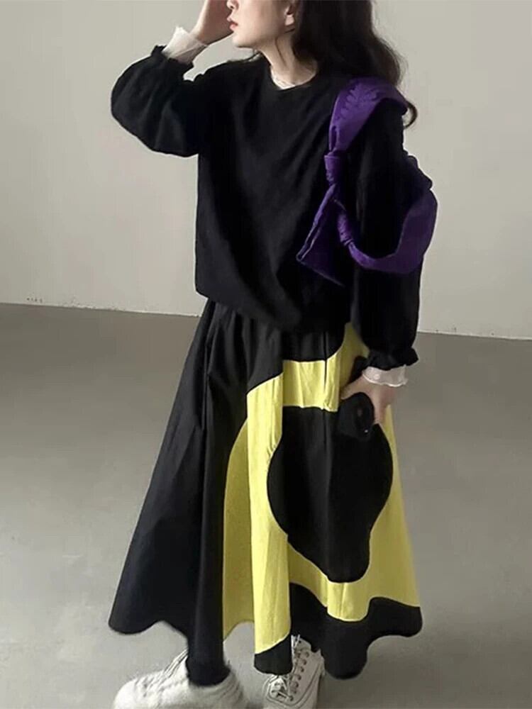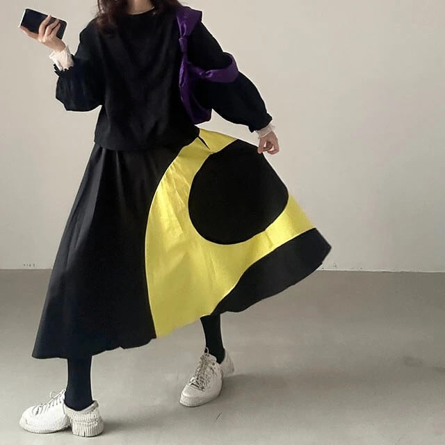 Nomikuma シック春レトロスタイルカラーコントラストスプライシングニッチ A ラインスカートハーフロングスカート スプリング 春物 Aライン