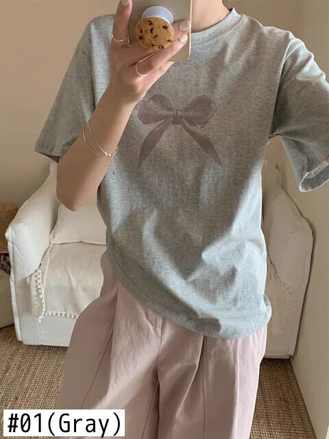 Nomikuma プリント リボン リボン 半袖 Tシャツ レディース 夏 ラウンドネック 万能 トップス ショート ハーフスリーブ サマー 夏物 Oネック