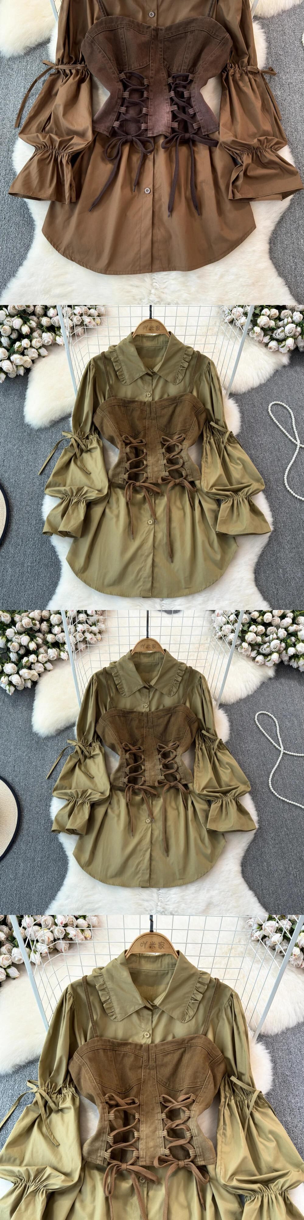 Nomikuma スパイシーガール白ミディアムロングシャツ 2024 春レトロデニムレイヤードベストツーピーストップセット ホワイト レッド スプリング 春物