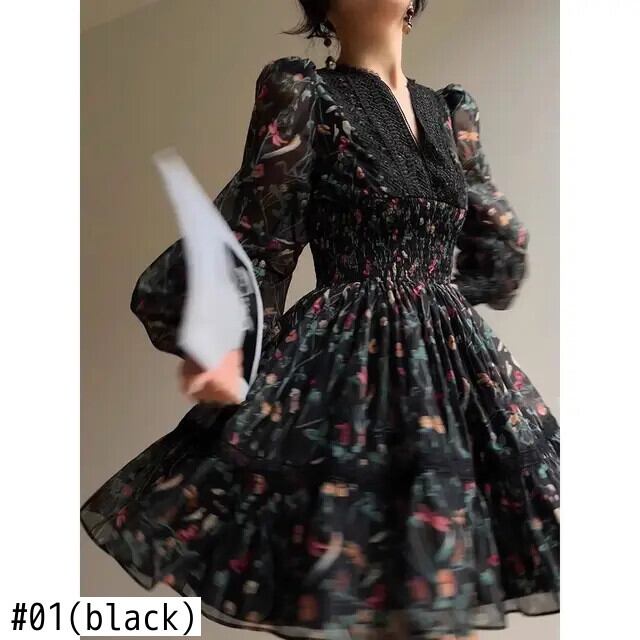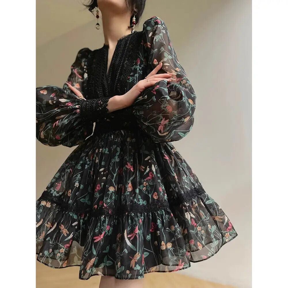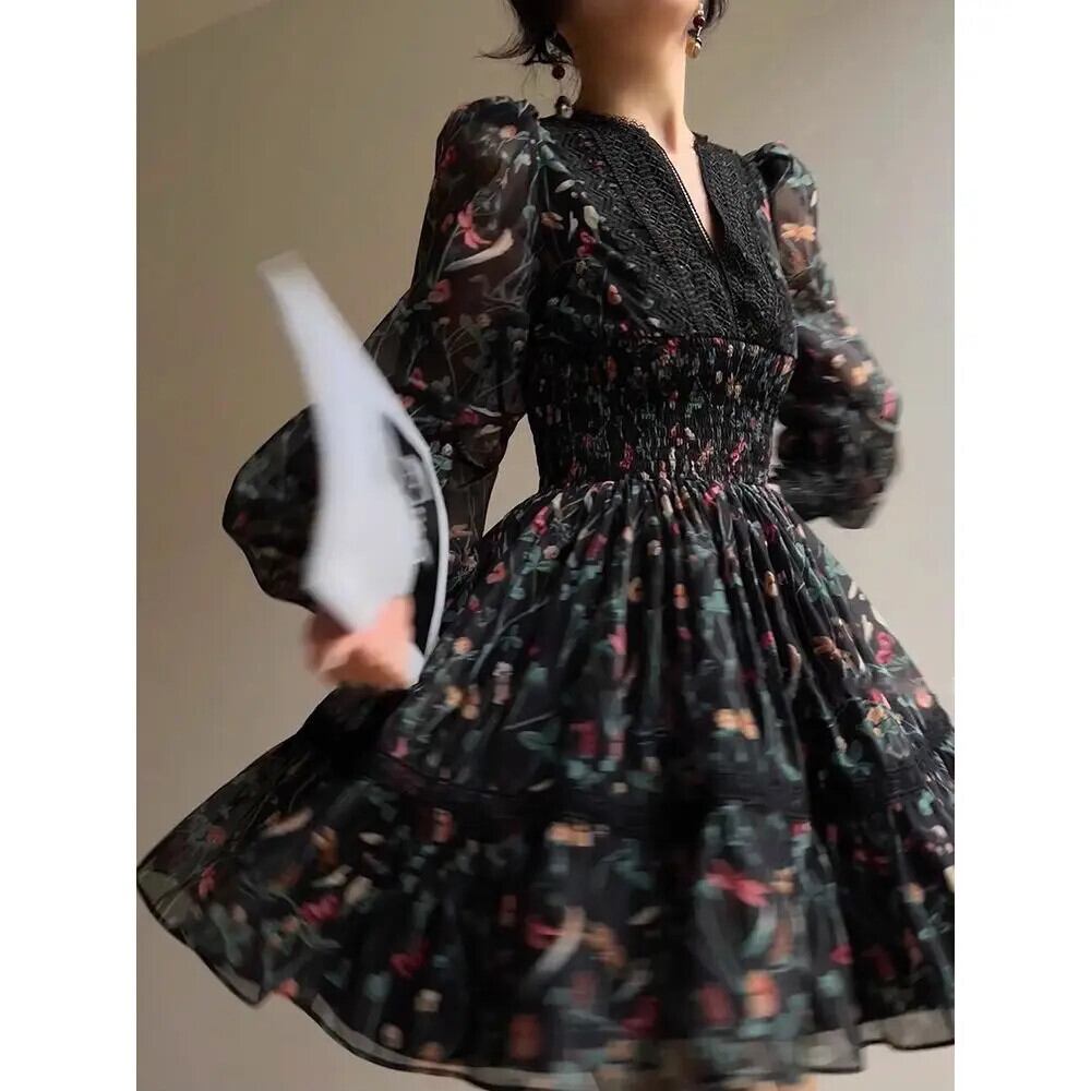 Nomikuma 2024 フレンチレトロプリントドレス V ネックレースパッチワーク Logn スリーブ因果 A ラインミニ Vestidos デ Vネック Aライン