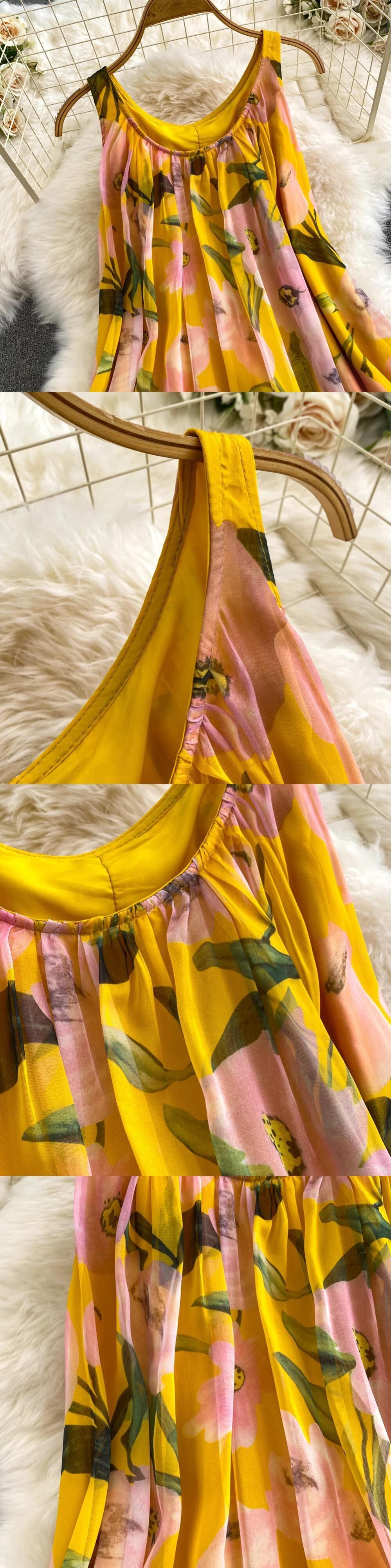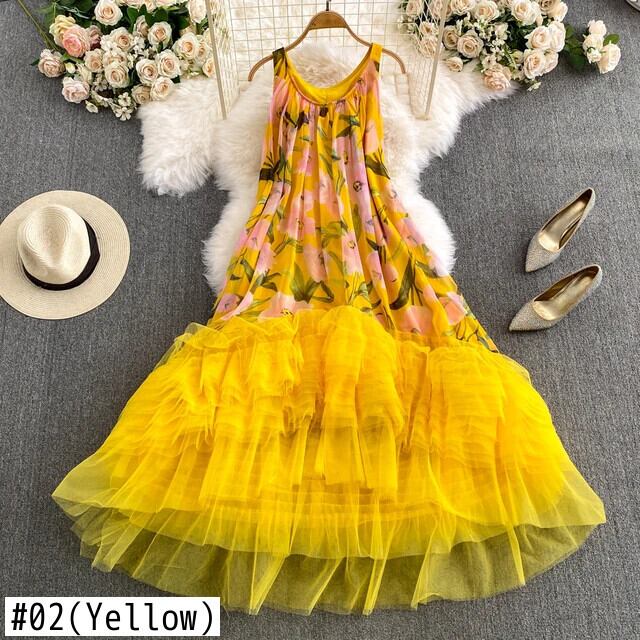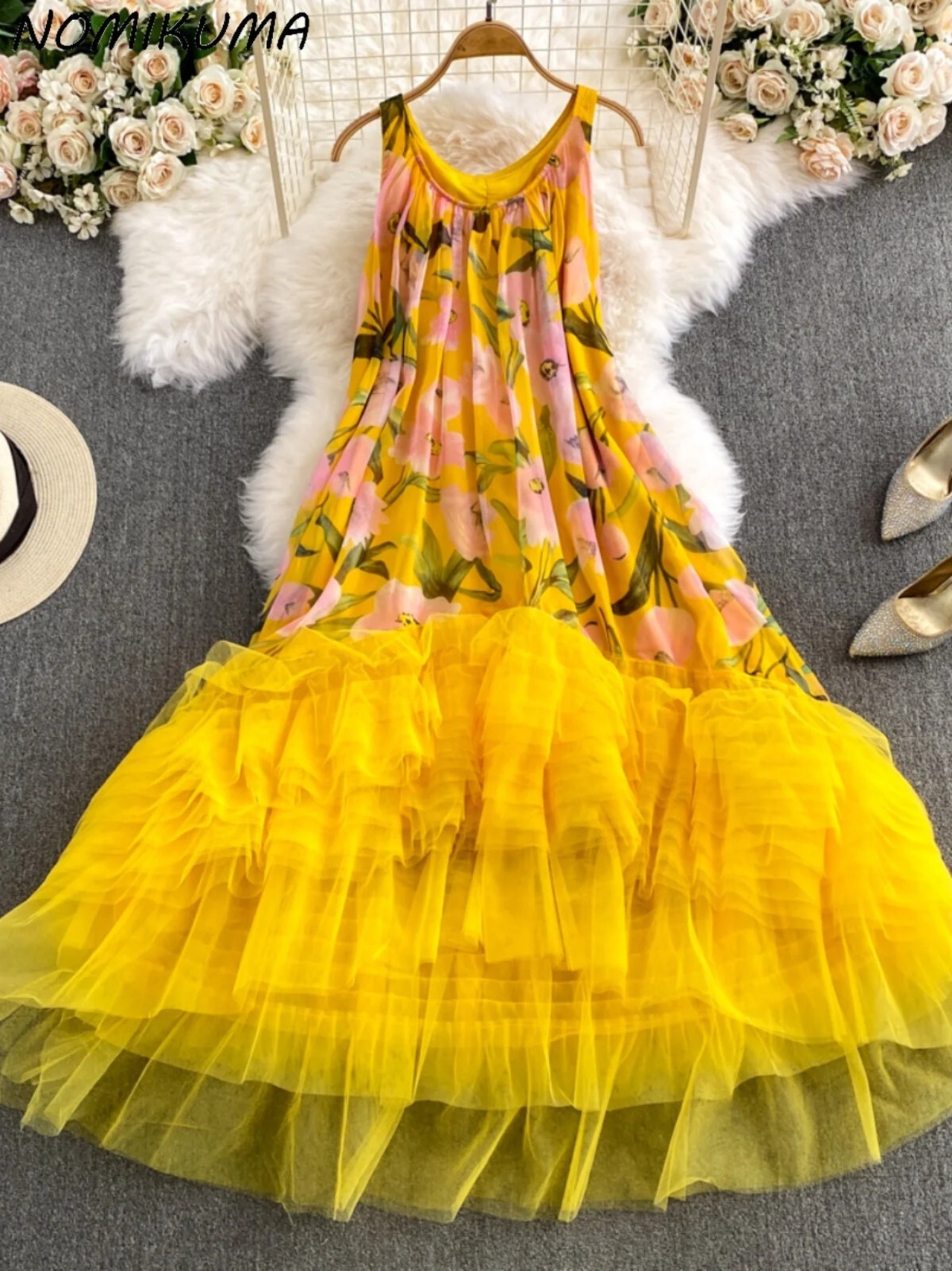 Nomikuma 2024 フレンチプリントメッシュフリルエッジ不規則ロングドレス因果 O ネックタンクドレス夏 Vestidos デ サマー 夏物 Oネック